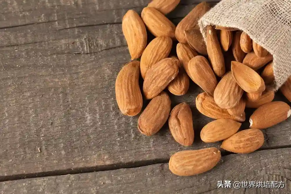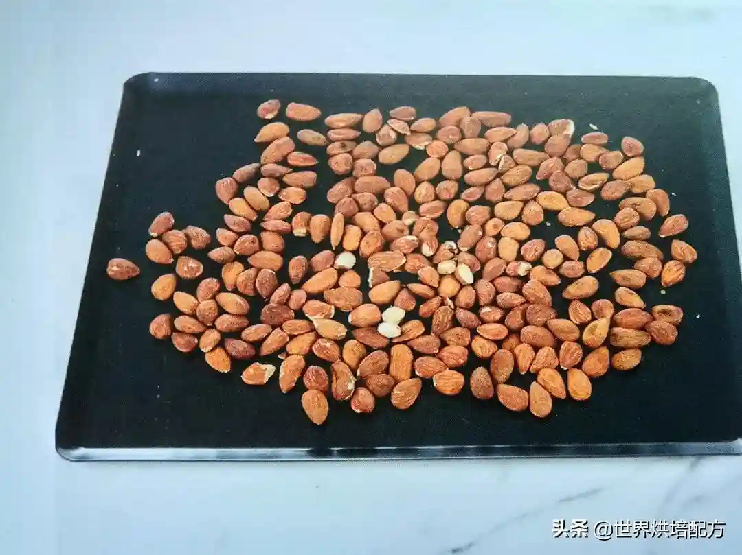 1、将杏仁用水冲洗去除灰尘,然后铺在不沾烤盘上,放入150℃的烤箱中烘烤约15分钟,出炉后冷却。