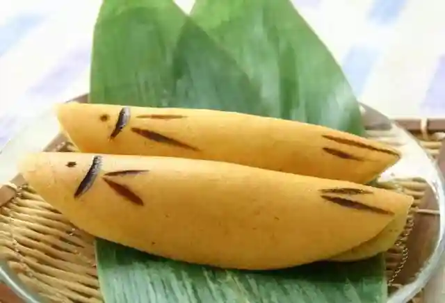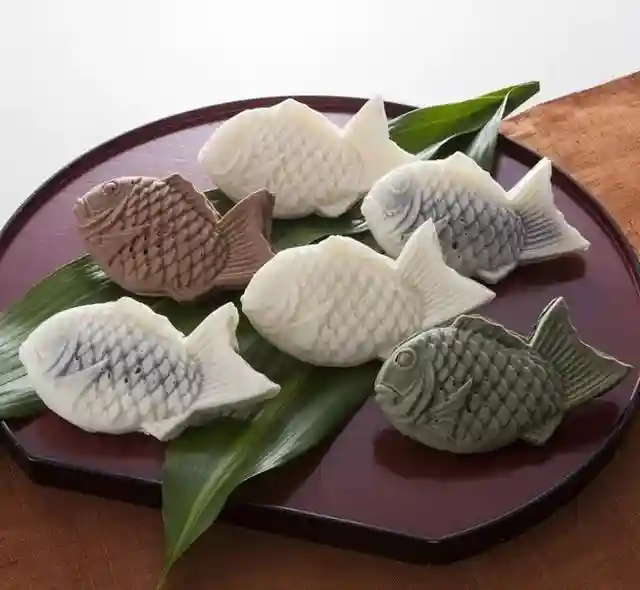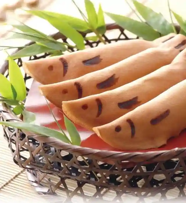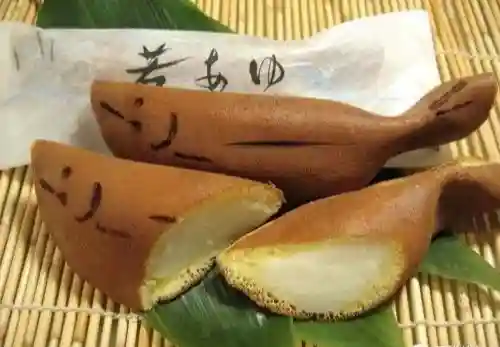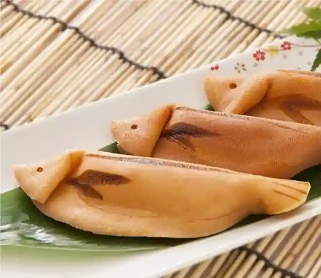 日式点心的一种,形如烧香鱼。用蛋糕质地的材料弄成椭圆形,接著切成半月形,用烙印加上了眼和鳍的符号。由于日本6月才会解除禁令,批准出售真正的香鱼。所以日本人才制成这一种点心,在关东地区,当地人常常把豆馅放入若香鱼中。