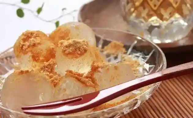 蕨饼也是日本夏天最具代表性的点心之一。食材主要取自蕨类植物根部淀粉,再混合水、砂糖制作而成,通常搭配黄豆粉一起吃;因为蕨粉加工比较复杂而显得珍贵,曾经是早期日本皇家贵族享用的甜点。炒香的黄豆粉温柔包覆着透明的厥饼,柔滑Q软,配着焦香的黑糖蜜,浓淡相宜,如古老的京都,时值相待。