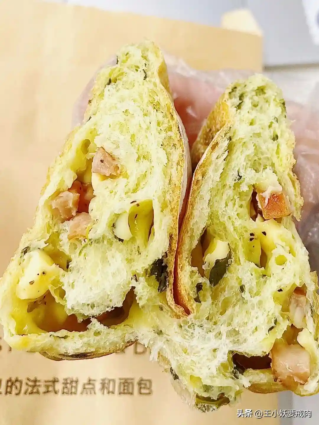 ✨菠菜芝士香肠咸面包:这款相对法棍,其实别有惊喜。撕开面包后特别湿润啊,面包轻咬感觉在呼吸,夹菠菜、香肠块很提味,咸香肉味是我的福报了。还吃到不少咸芝士小方,仿佛在舌尖谱出完美三重奏,爱吃。