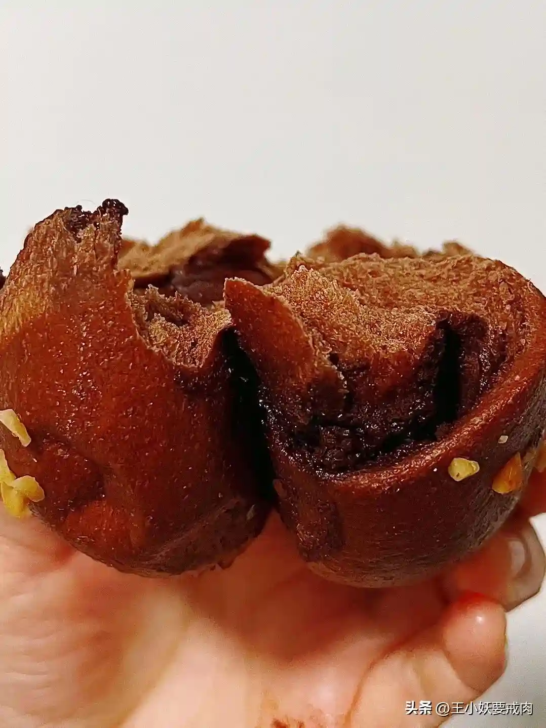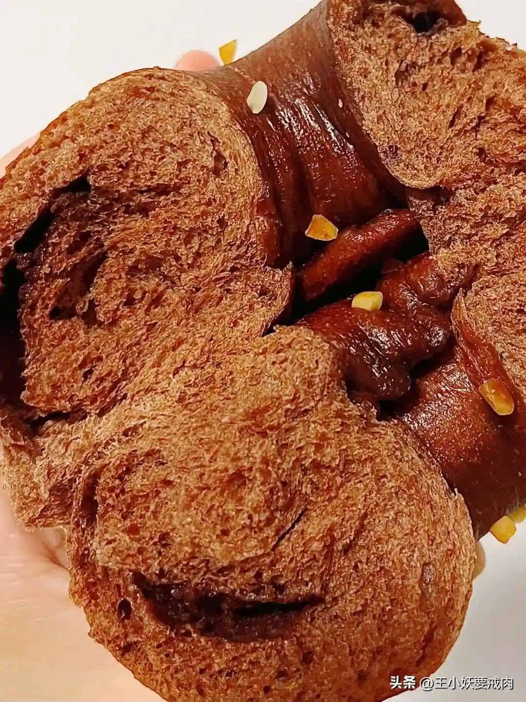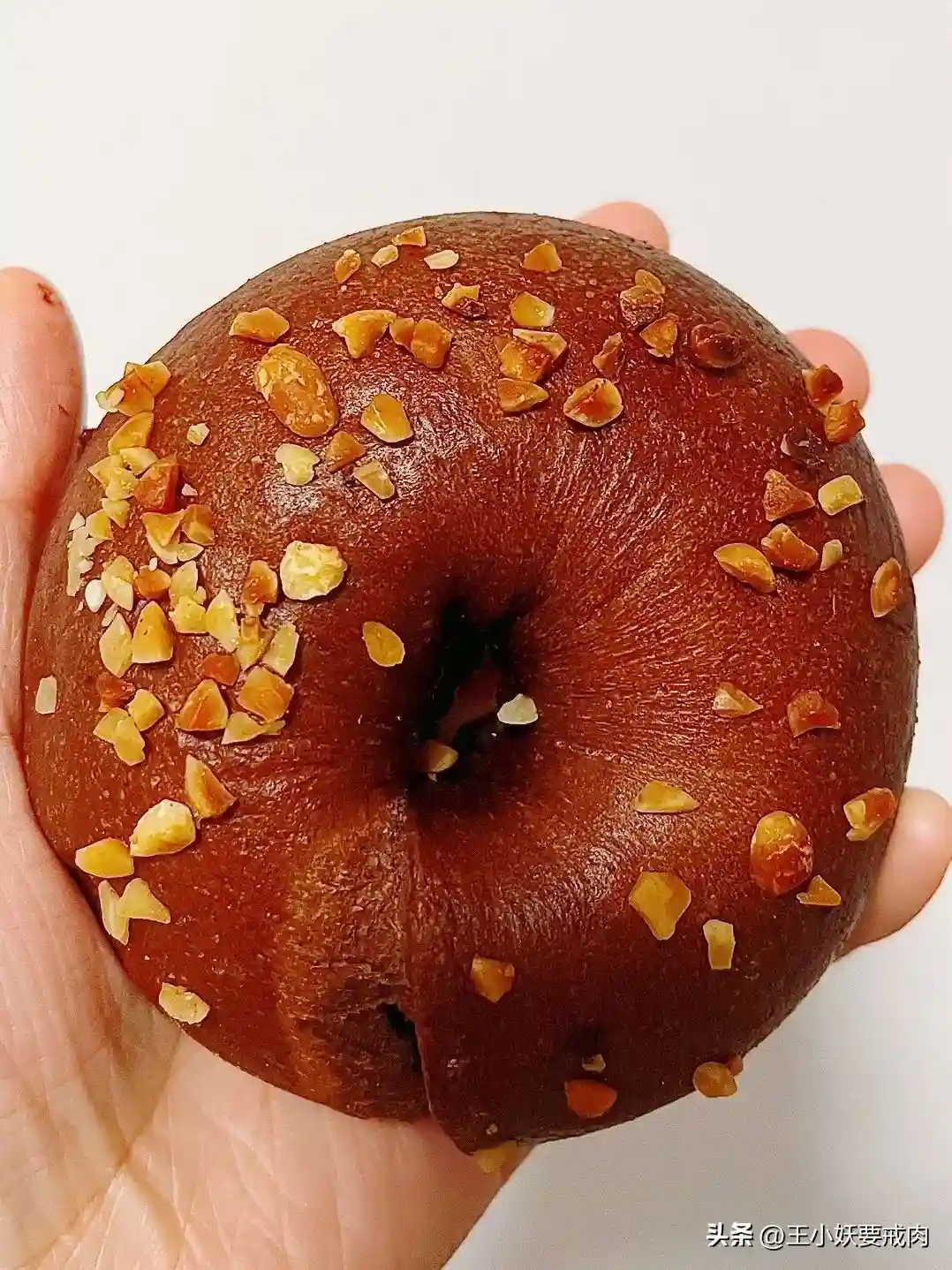 ✨巧克力贝果:贝果会比咖啡店里的湿软很多。这只从上手开始,巧克力就不停地沾手啦。最上层坚果碎吃不出来是啥,应该不是我讨厌的花生。