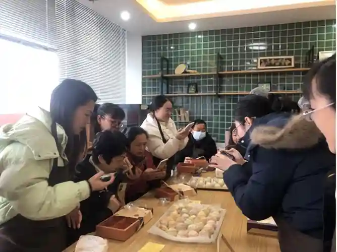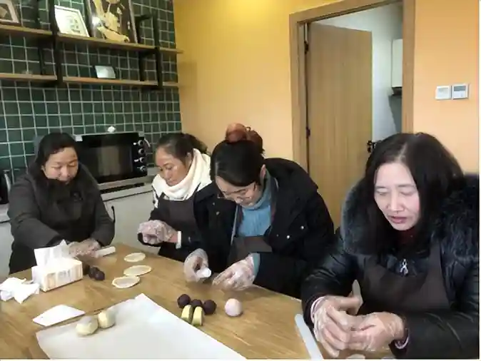 随后为大家分发了咸鸭蛋、面团等制作所需的原材料。在一切准备工序就位后老师一边讲解一边示范:“先拿一块油酥面团,按压一下,用擀面杖前后擀成一个圆形,至少是馅料的2倍大……”。按照老师要求,大家戴好手套,试着模仿起来,揉面团、擀皮、裹馅儿、再用虎口轻轻收紧,每一步都细致入微,有条不紊,忙而不乱的进行当中。看着亲手制作出的一个个圆滚滚的蛋黄酥逐渐成形,大家既兴奋又满足。