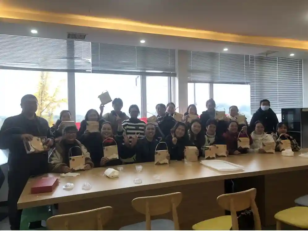 在一双双巧手的揉捏下,一个个彩虹色的蛋黄酥装盘进了烤箱。在等待糕点出炉的过程中,大家一边折包装礼盒一边交流着自己的心得体会,分享着生活中的点滴故事。现场氛围其乐融融,热闹温馨。半个多小时后,空气里都弥漫着香喷喷的味道,大家都迫不及待地想要去吃一个。当蛋黄酥从烤箱中拿出来的时候,众人脸上难掩幸福快乐之情。高颜值香酥难挡的美味获得了大家满满的赞美,都拿出手机拍下照片,记录此刻的成就。