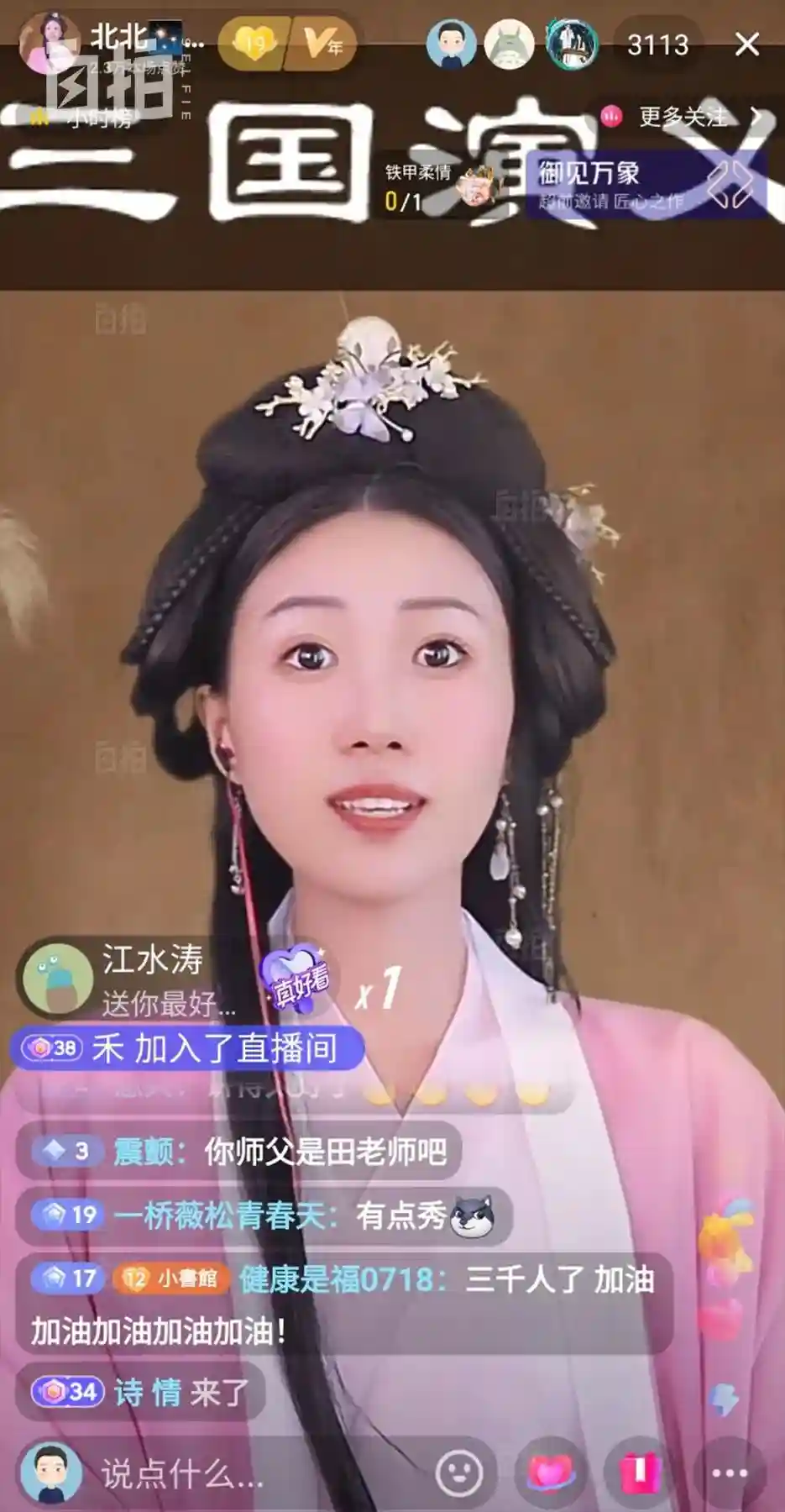 我印象很深的一条弹幕,是在我讲《三国演义》的时候,有个年轻人发弹幕说,他爷爷不太会用手机,但是每天会在手表上定个闹钟,看时间到了,就找他孙子说,要看这个小姑娘讲故事。那个老爷爷甚至不知道抖音是什么,也不懂直播这些新鲜事物,但偶然间听到了,就会每天来听我讲。