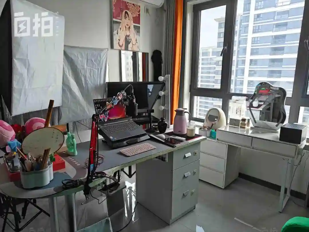 这是我平时直播的房间,面前是打光的设备,旁边放着扇子等小道具。