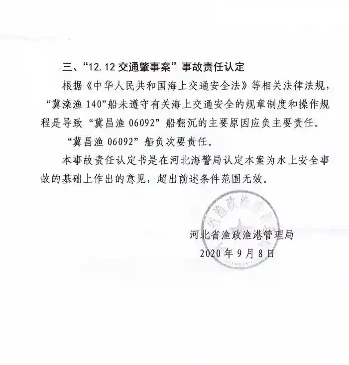 2020年9月,河北省渔政渔港管理局作出《12.12交通肇事案事故责任认定书》。该认定书的结论为:“冀滦渔140”船未遵守有关海上交通安全的规章制度和操作规程,是导致“冀昌渔06092”船翻沉的主要原因,应负主要责任;“冀昌渔06092”船负次要责任。