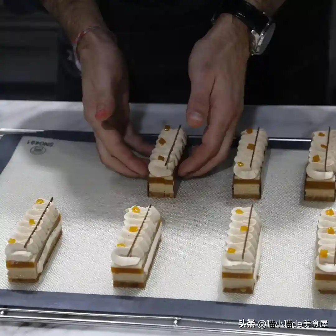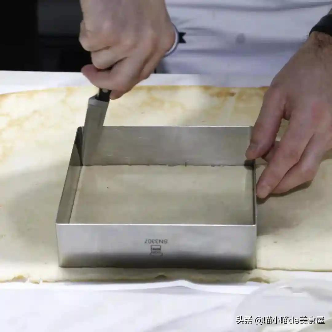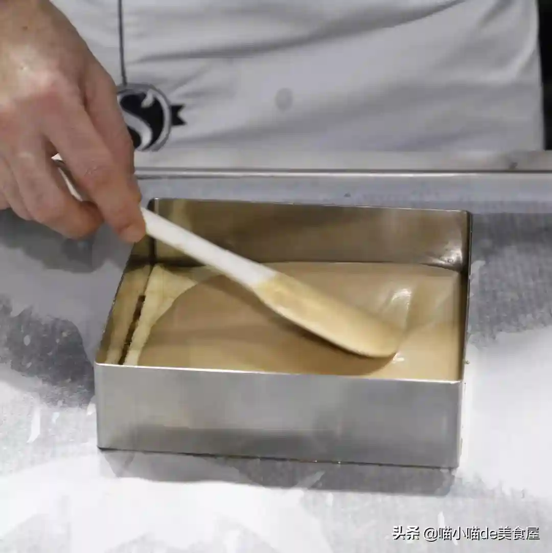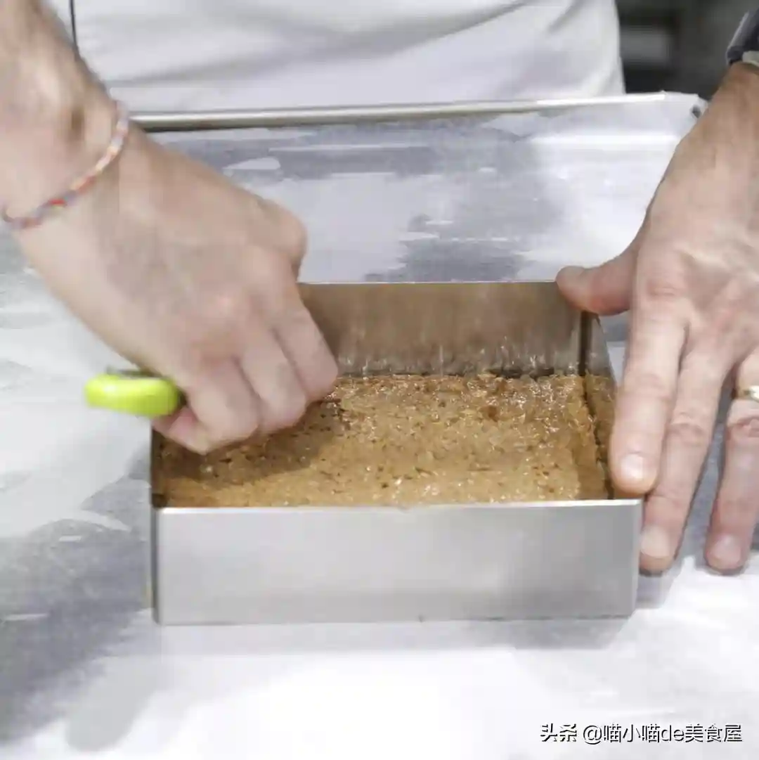 制作过程:1.将扁桃仁脆脆倒入方形慕斯模具中,用小抹刀抹平,厚度约3毫米。