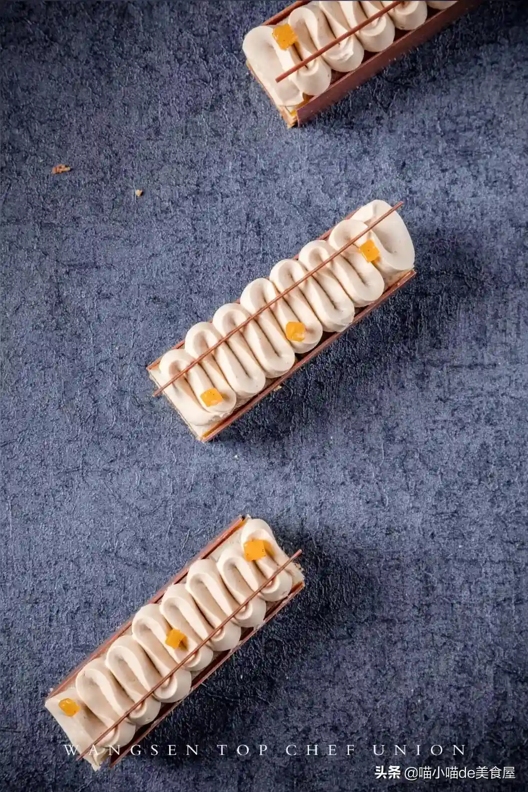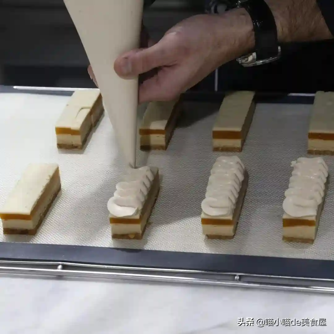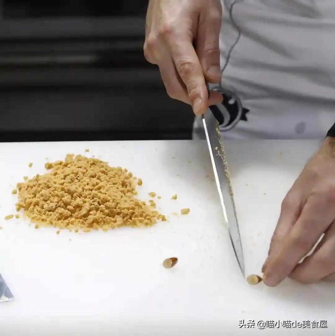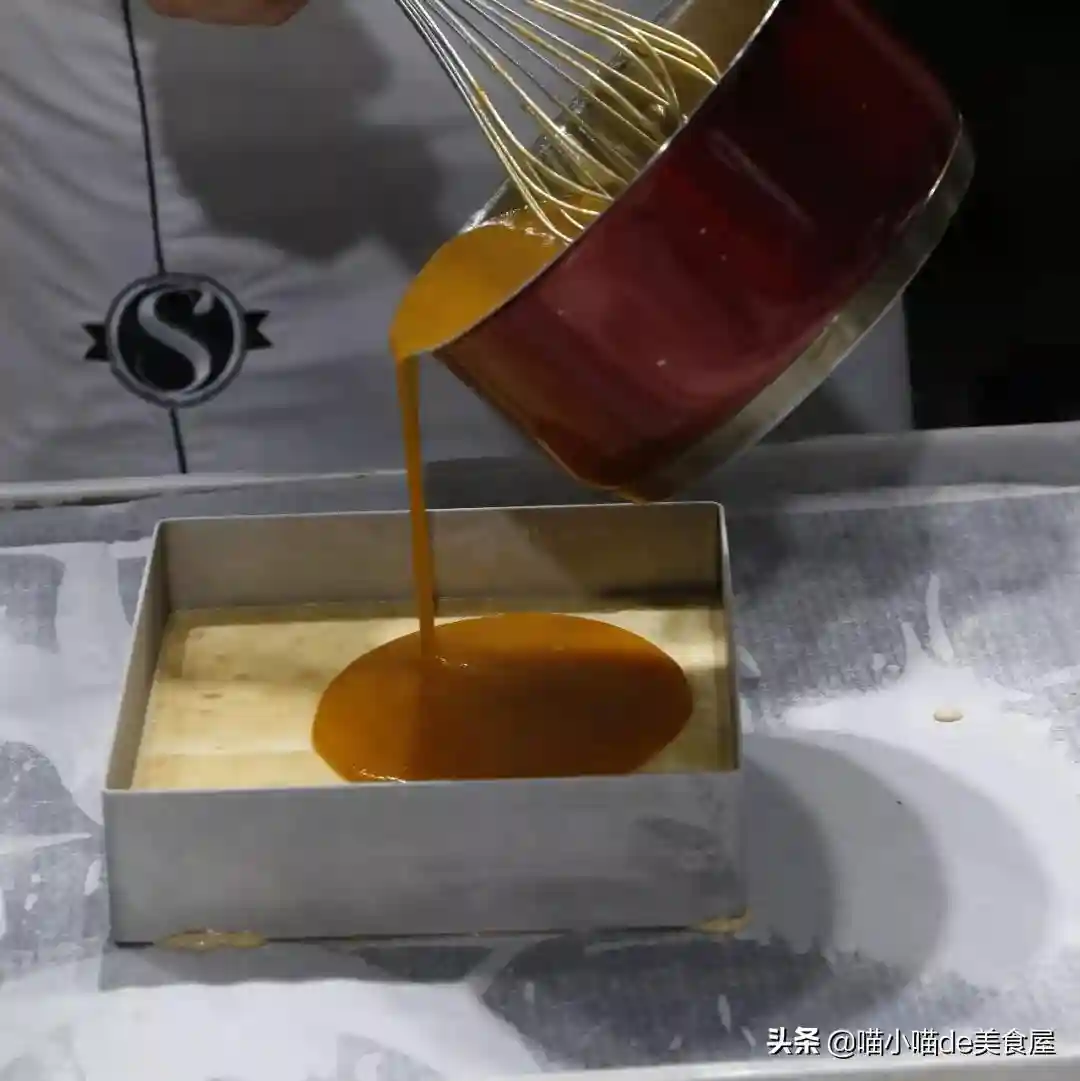 制作过程:1.将扁桃仁脆脆倒入方形慕斯模具中,用小抹刀抹平,厚度约3毫米。