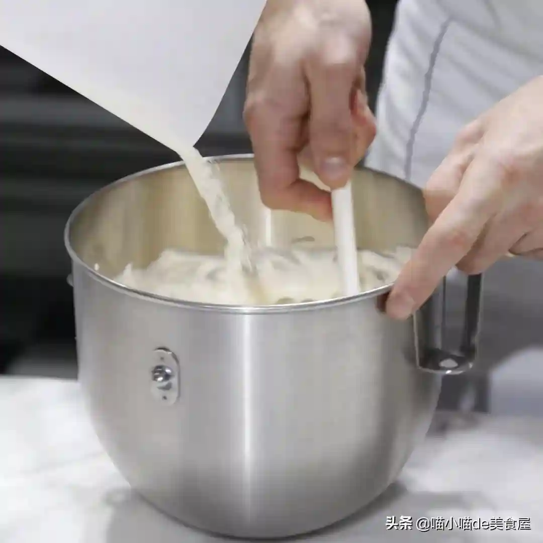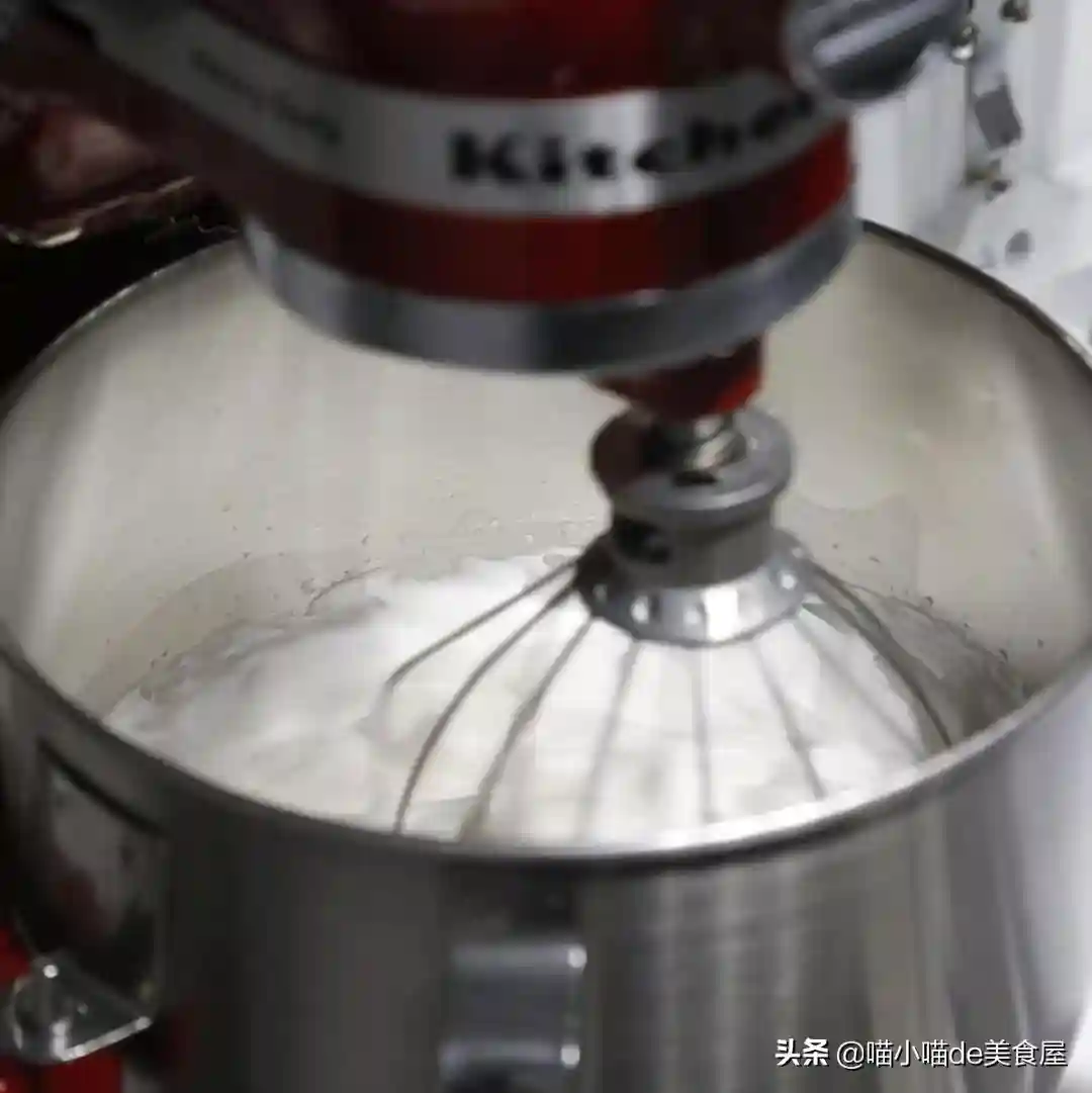3.蛋白倒入搅拌桶中,分次加入细砂糖,使用球形搅拌器打发。