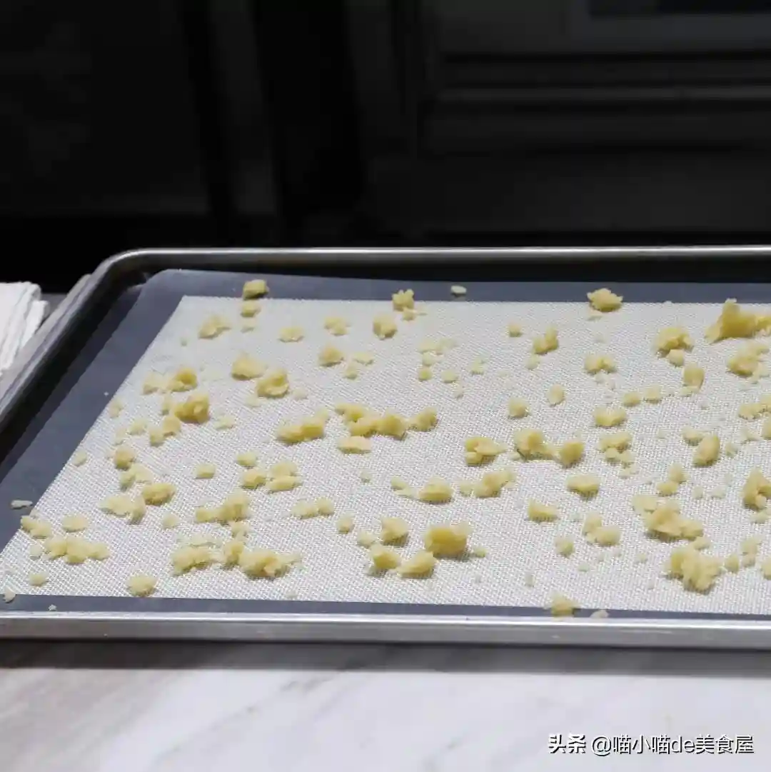 2.将面团捏碎,平铺在垫有硅胶垫的烤盘上,入炉,以150℃烘烤20分钟左右。