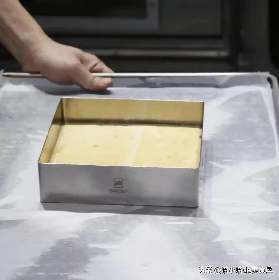 7.出炉,冷却后使用边长20厘米的方形圈模,压出3块饼底,备用。