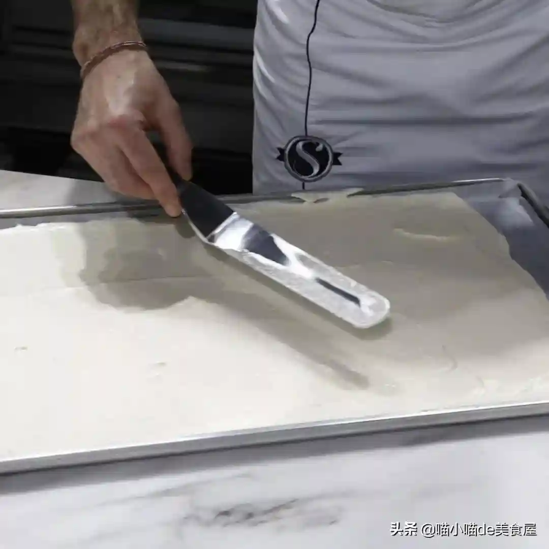 6.将面糊倒入垫有油纸的烤盘中,使用曲面抹刀抹平;入风炉,以180℃烘烤8至10分钟。