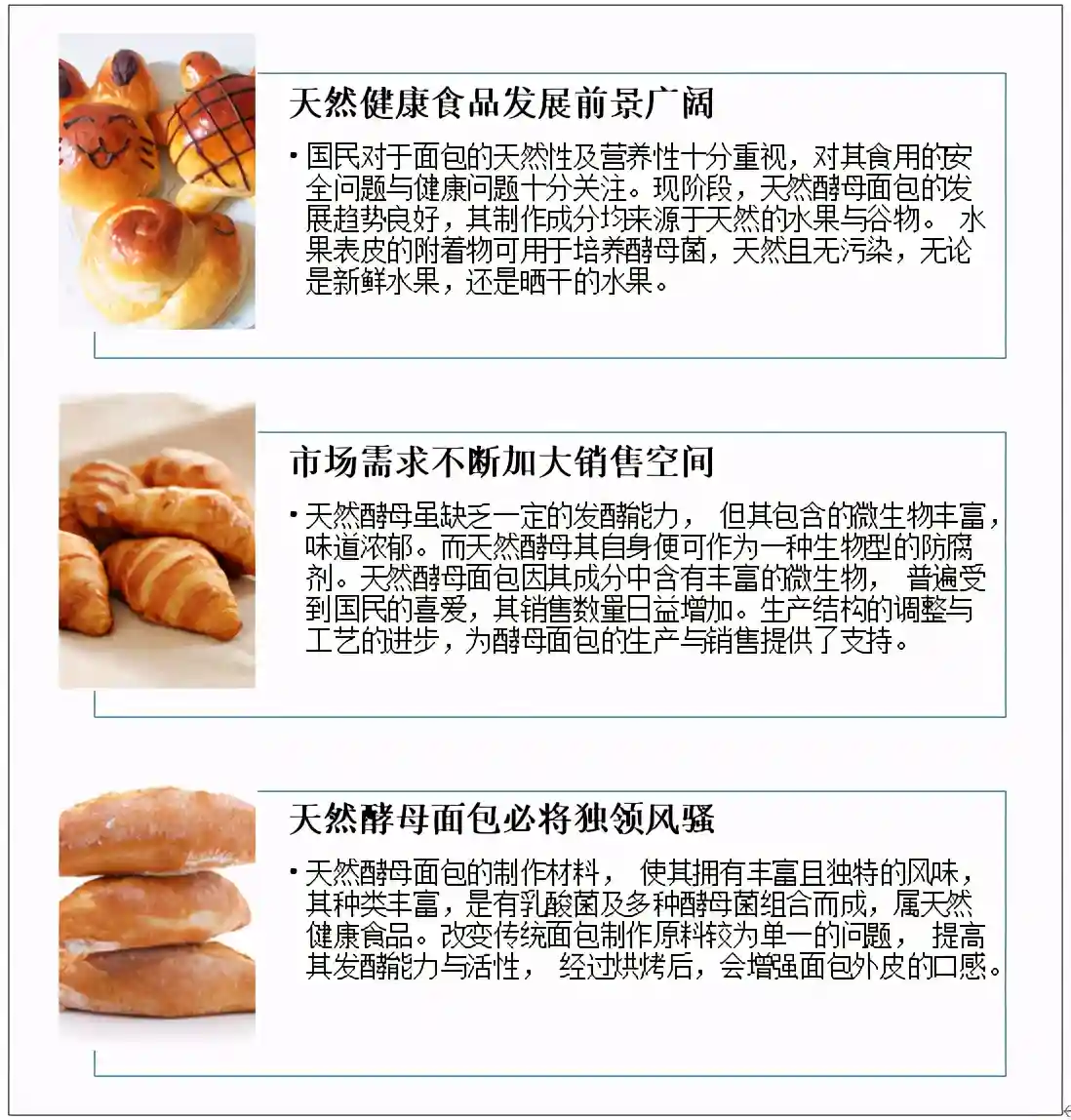 21世纪,食品的发展趋势是健康与安全,人们不但要吃得饱,还要吃得好。对于食品问题,国民始终是将健康安全放在首要位置。随着生活水平的提升,国民对食品的要求日渐提高,既要求其健康美味,又要求其种类丰富,口味独特。天然酵母面包,其具有一种名为酵母菌的成分,是生物疏松剂,有增大面包体积的作用,使得面包呈海绵状,结构多孔,且质地松软。