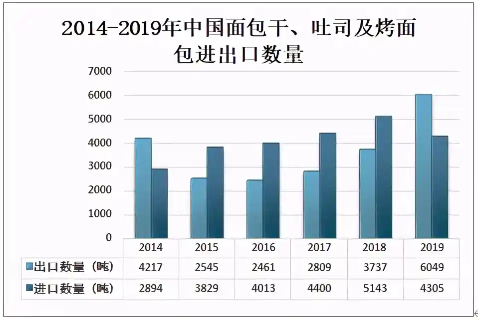 据中国海关数据显示,2019年中国面包干、吐司及烤面包进口数量为4305吨,同比下降16.3%;中国面包干、吐司及烤面包出口数量为6049吨,同比增长61.9%。