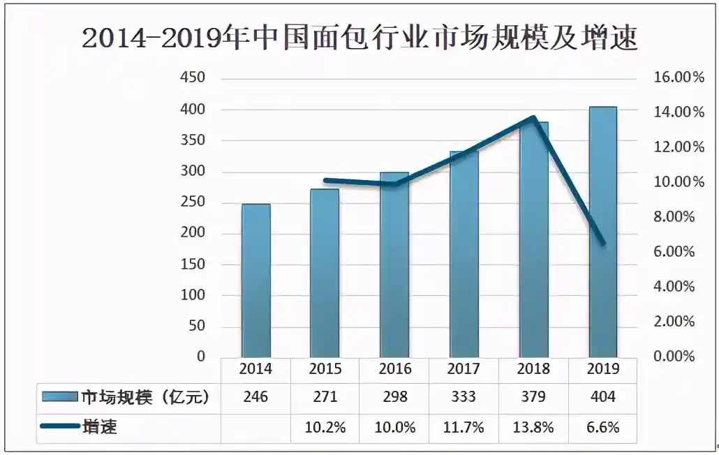 由于生活节奏的加快,消费者原来对于面包的消费也越来越快速,整体消费周期的缩短以及对口感要求的提升促使面包往短保质期产品发展。2019年中国面包行业市场规模为404亿元,同比增长6.6%。