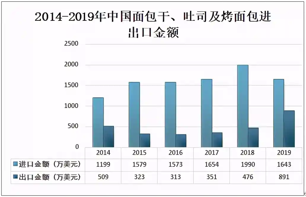 2019年中国面包干、吐司及烤面包进口金额为1643万美元,同比下降17.4%;中国面包干、吐司及烤面包出口金额为891万美元,同比增长86.9%。