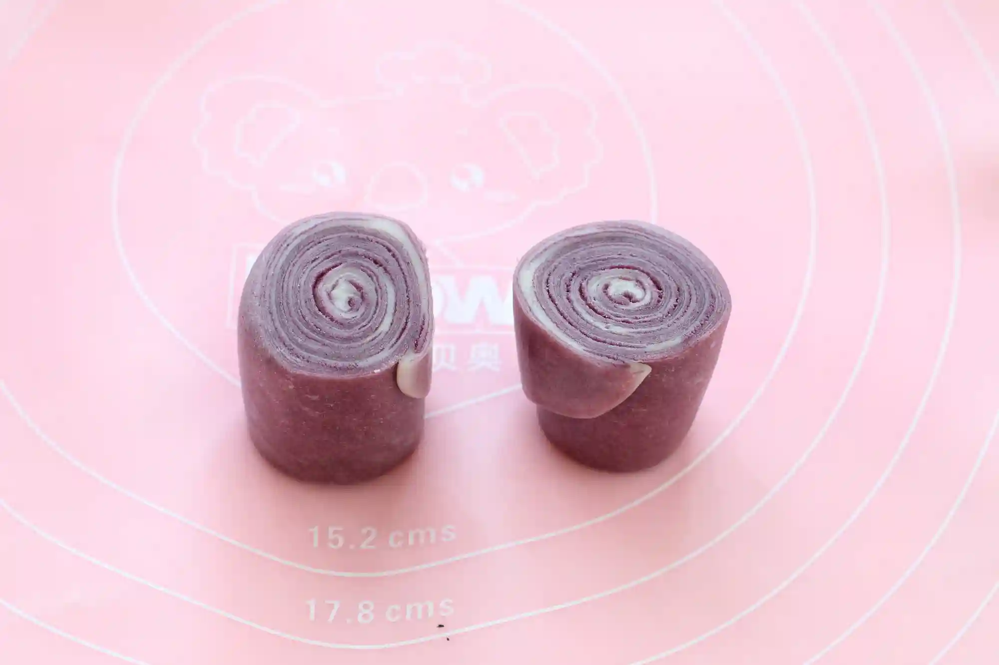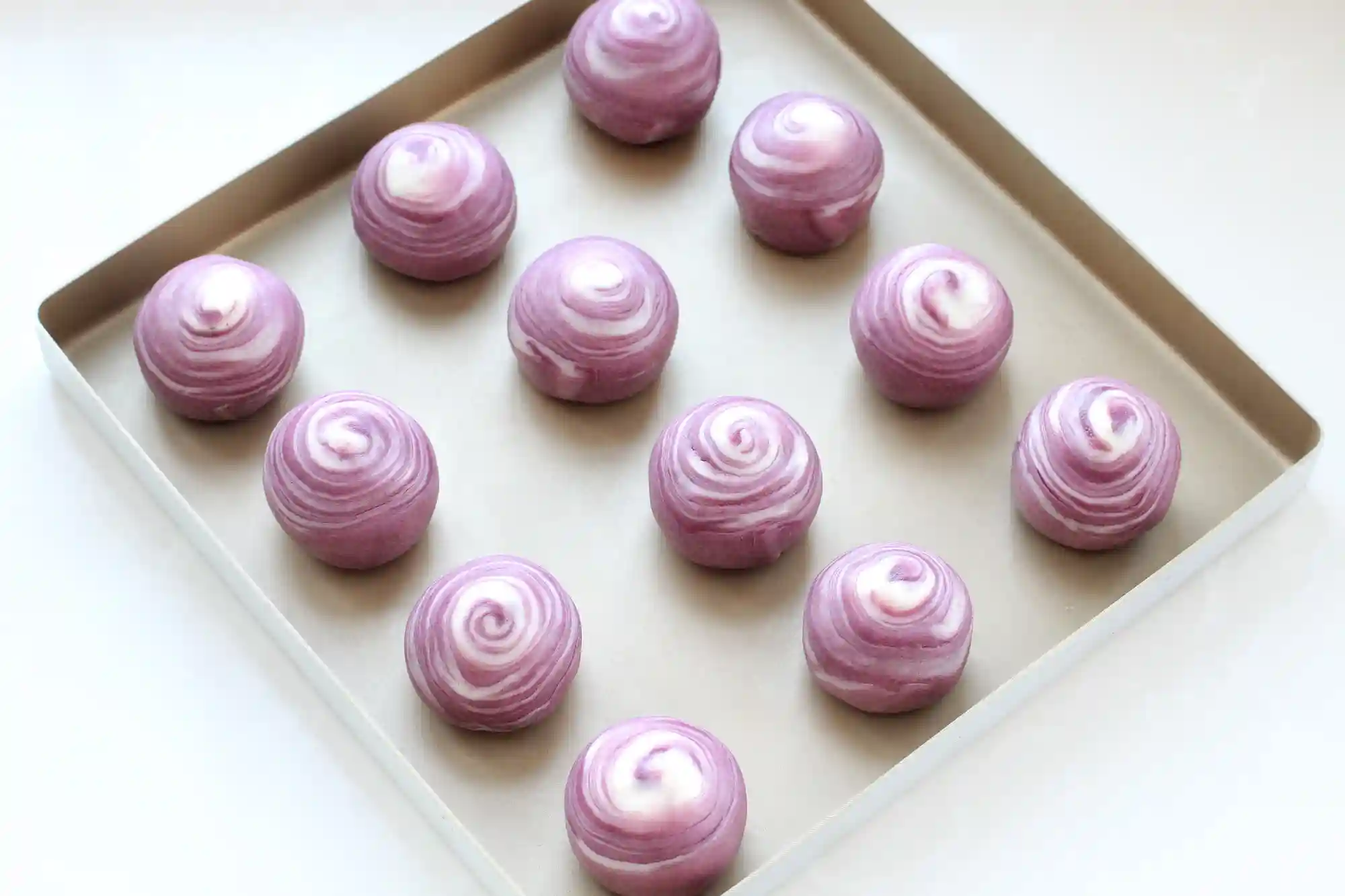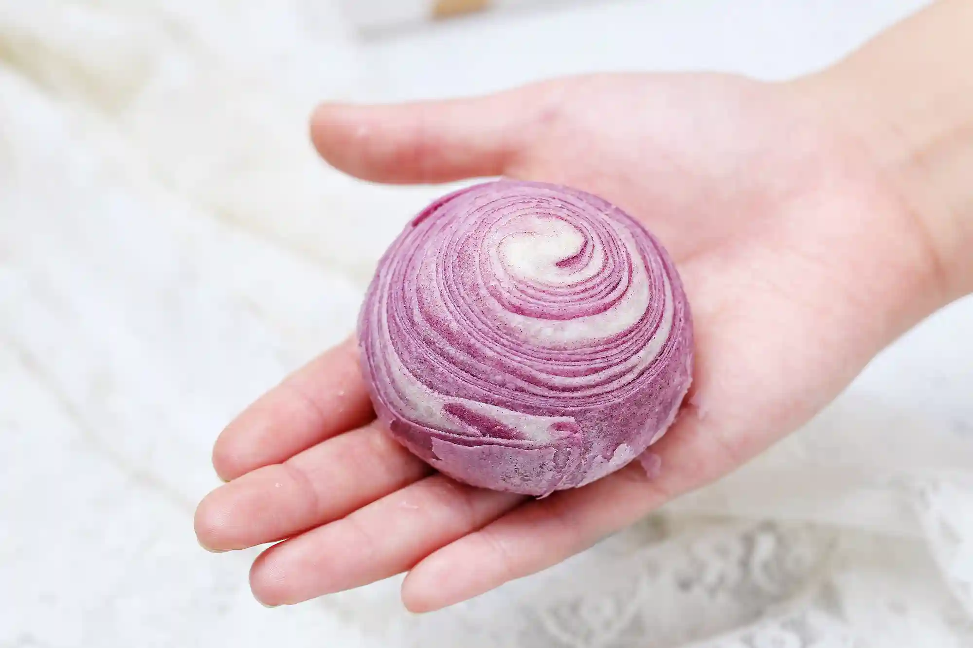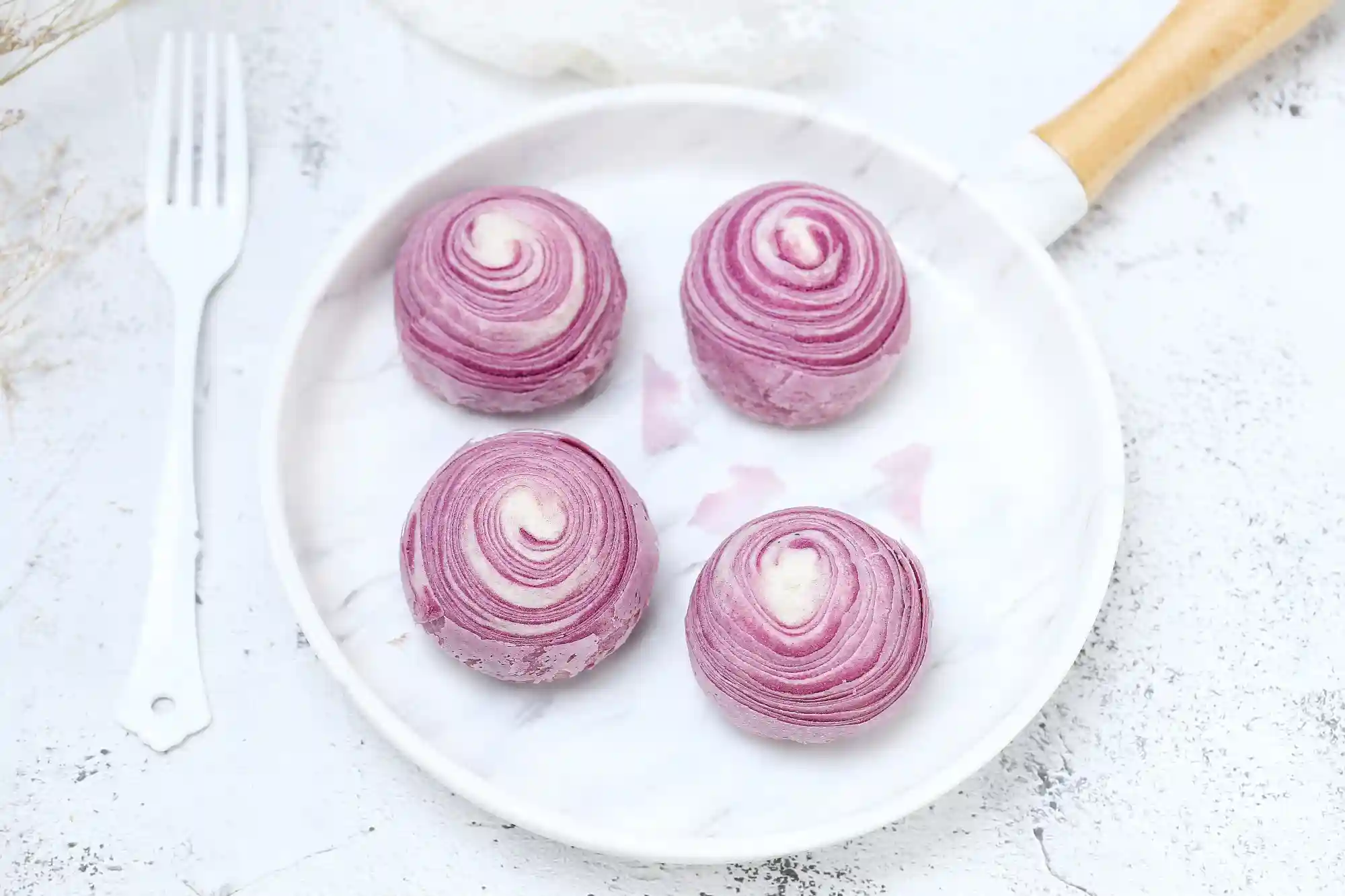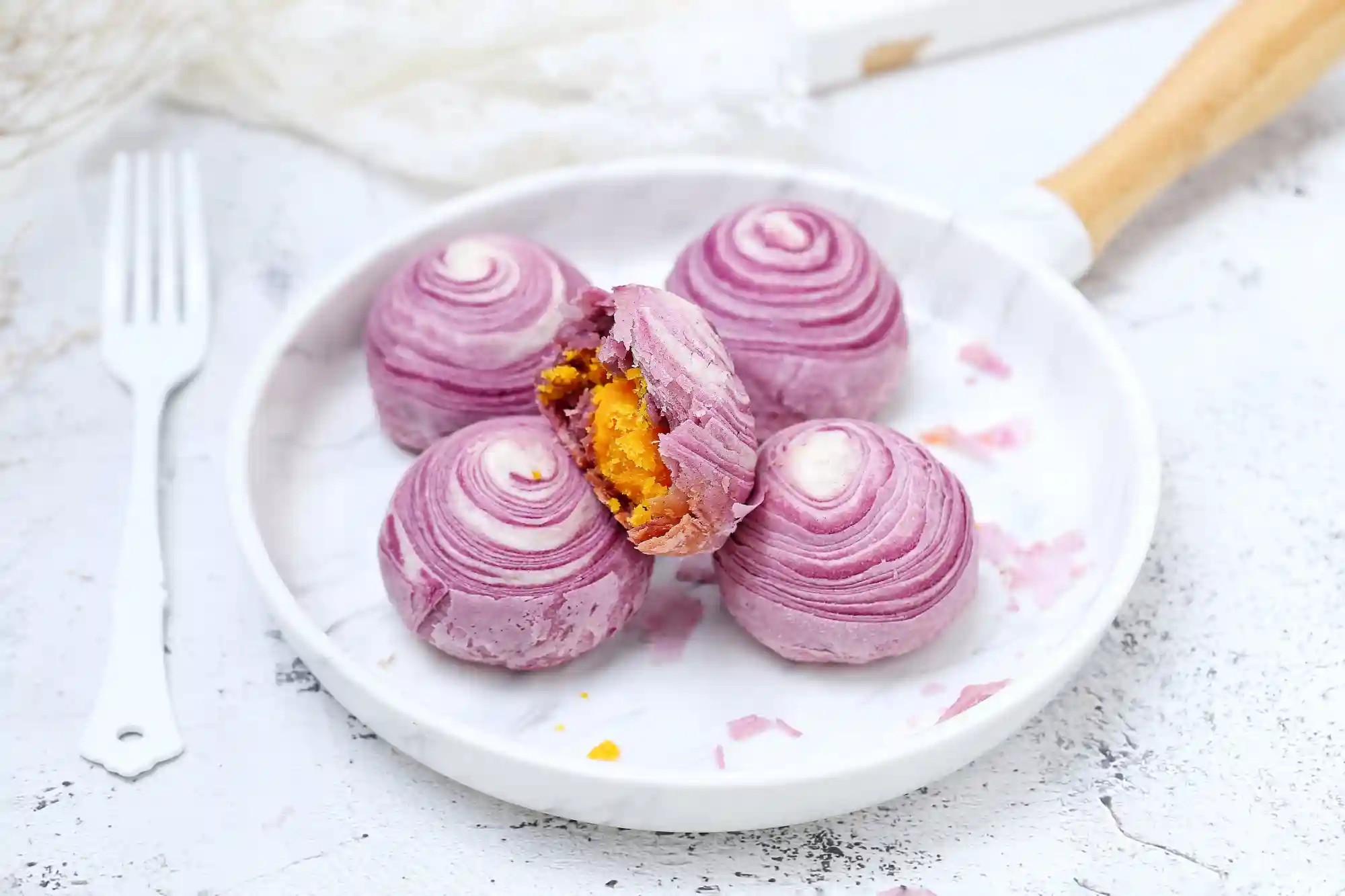 蛋黄酥虽然要用到烤箱,但它却是咱们中式的传统糕点,主要食材为普通面粉、猪油、馅料和咸蛋黄,制作过程与苏式月饼有很多共同之处。我个人很喜欢吃蛋黄酥,咸香适中、外酥内软,咬一口直掉渣。其实蛋黄酥的做法并不难,就是比较耗费时间,正好现在也闲得无事可做,就做了这款紫薯芋泥蛋黄酥,酥皮部分的紫色和白色形成漂亮的纹理状,层次分明简直美炸天了!下面就将配方比例和做法分享出来,只要按照步骤操作,保证一次就能成功!