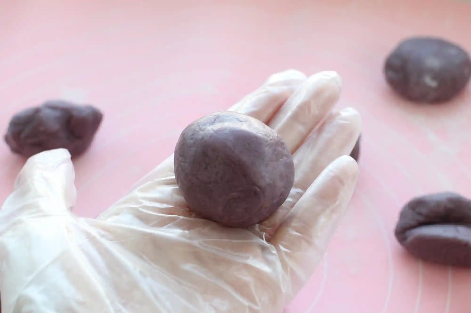 2.芋泥馅分成均匀的12份,每份25克分别滚圆按压成饼皮,中间放一个烤好的蛋黄。