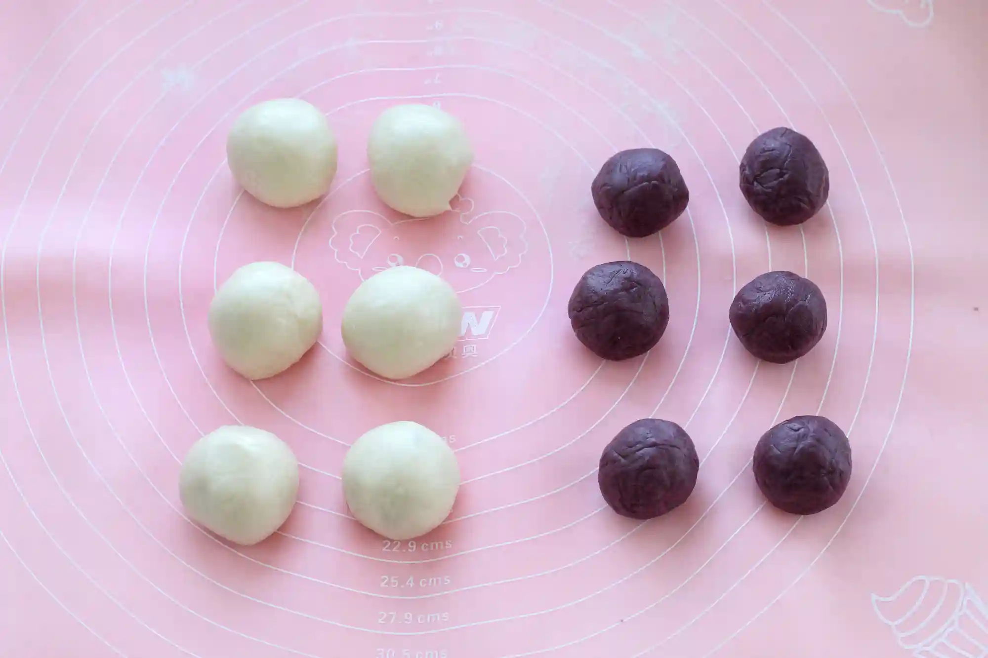 5.将水油皮面团和油酥面团各自分成均匀的六份,滚圆备用。