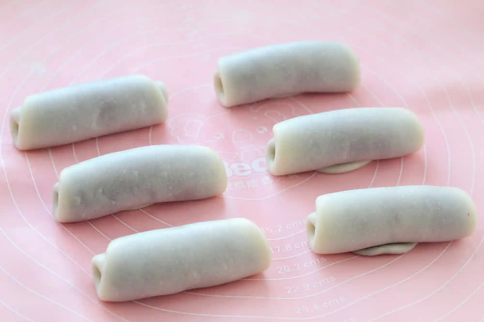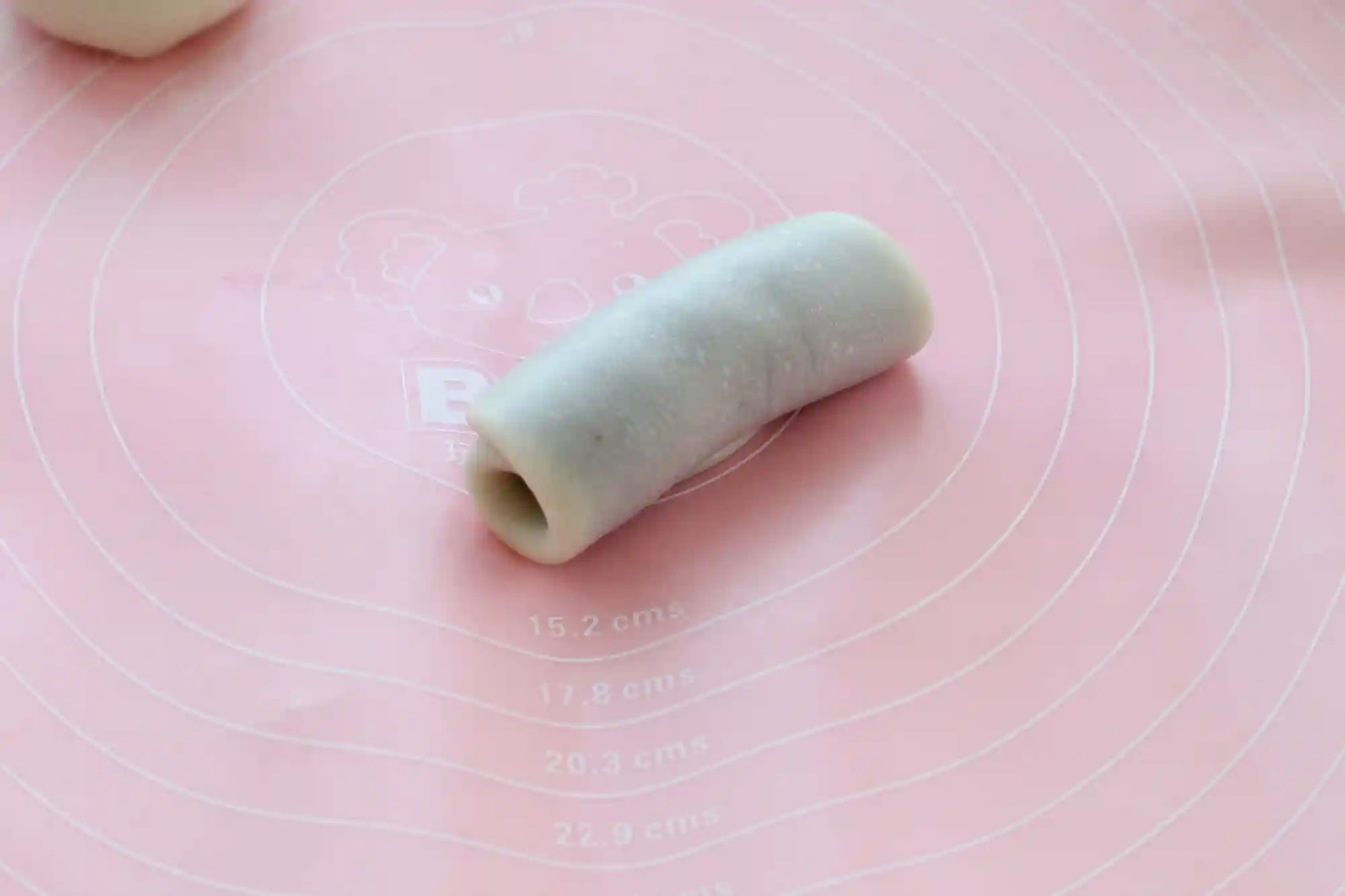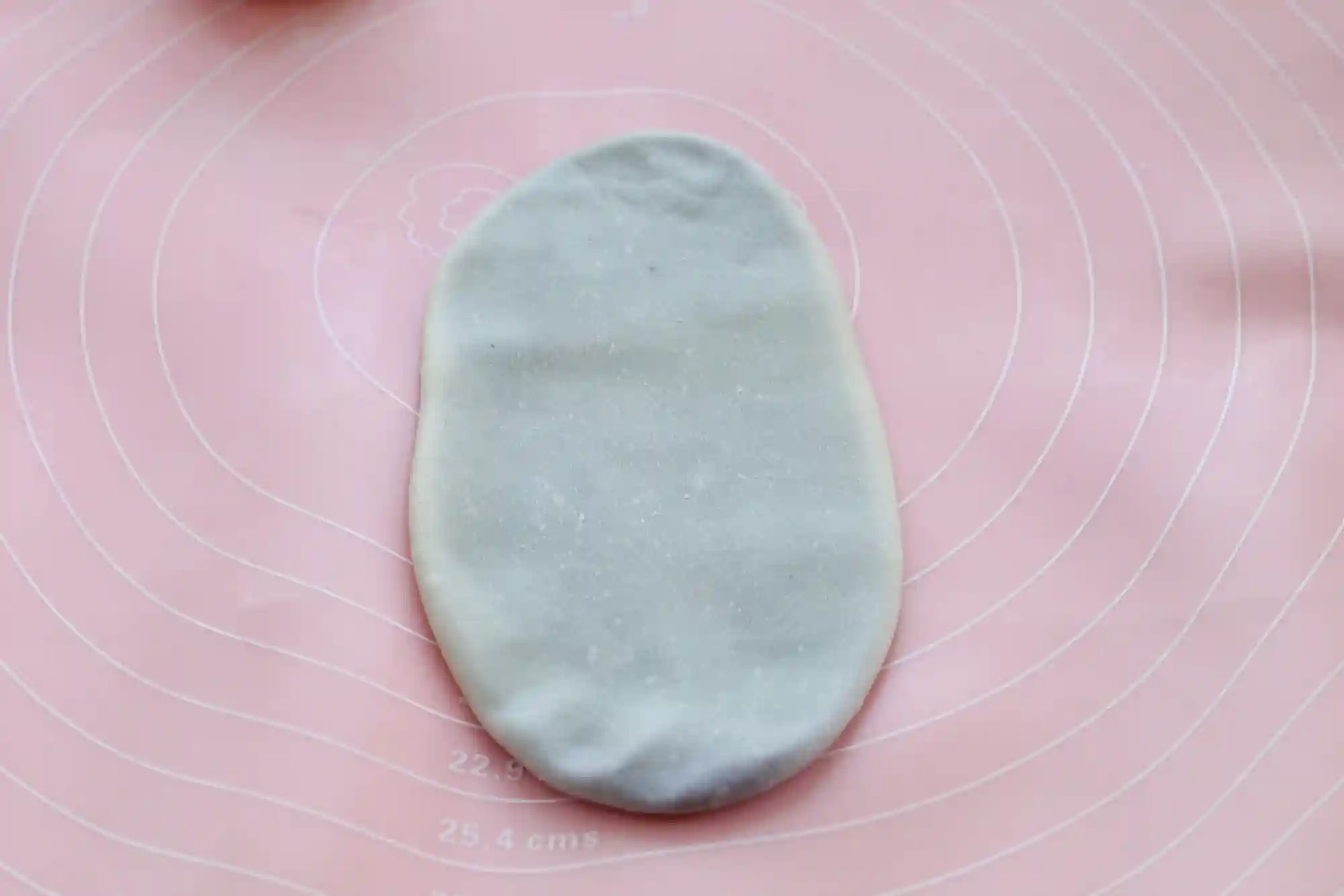 7.收口朝下按扁,再用擀面杖擀开成长舌状。