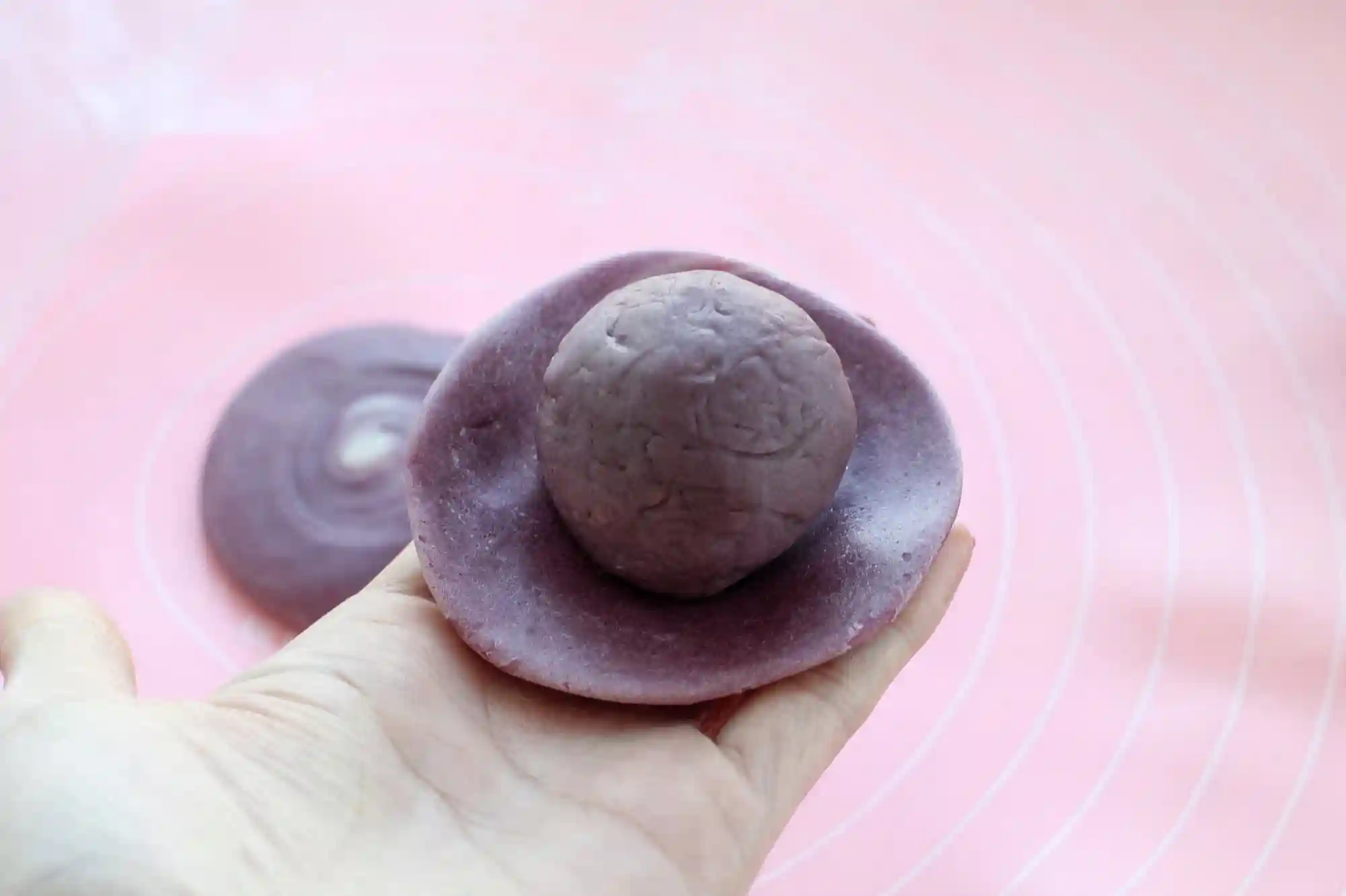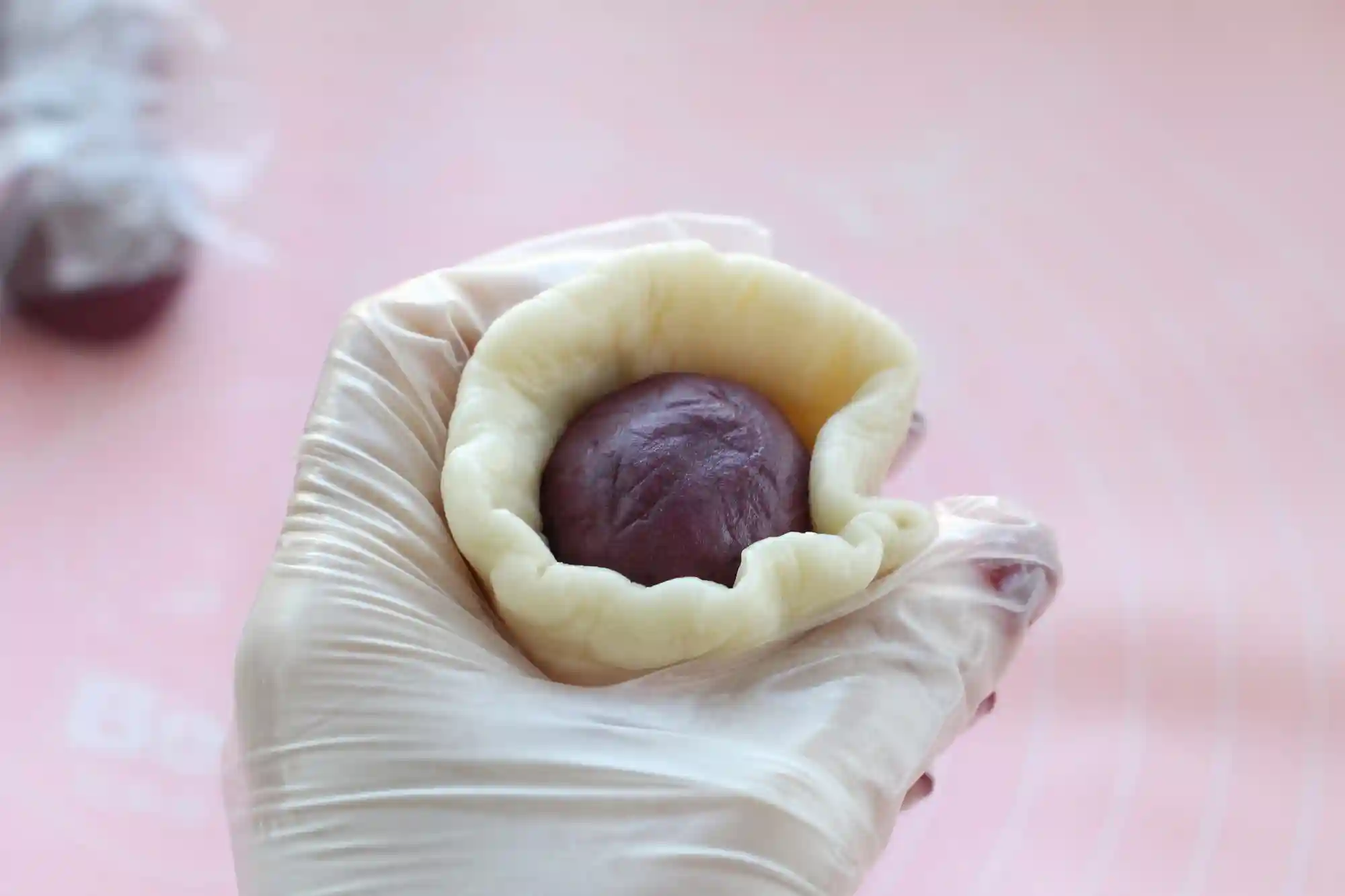 15.将饼皮翻过来中间放上芋泥蛋黄,同样用虎口向上收口。
