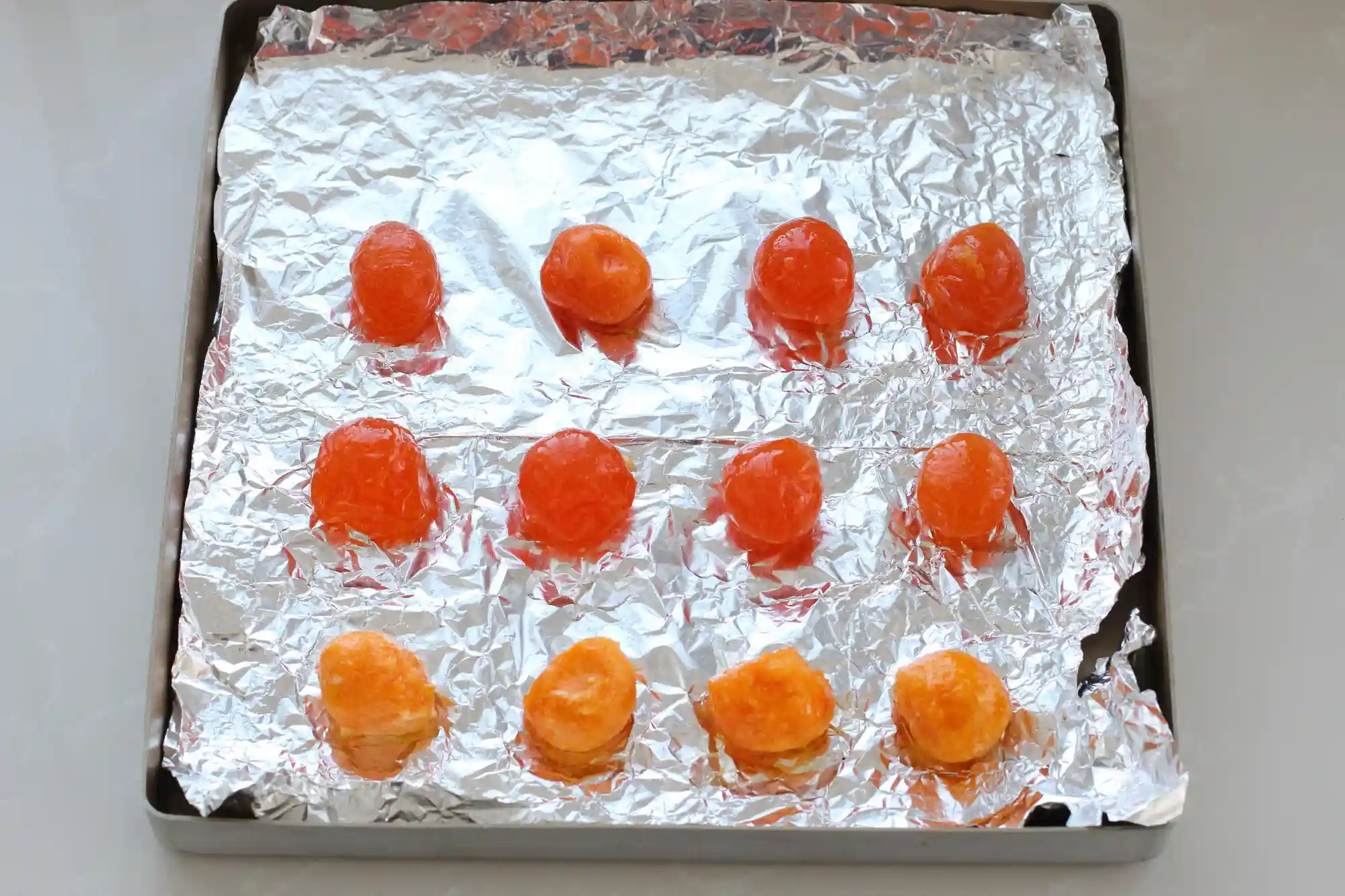 1.将咸蛋黄用玉米油浸泡一晚,再放到铺有锡纸的烤盘中,表面喷少许高度白酒,放进烤箱中层上下火160度烤约8分钟,出炉晾凉。