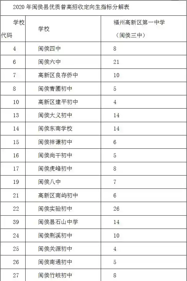 面向闽侯及福州高新区地域招收480人,其中定向分配如下: