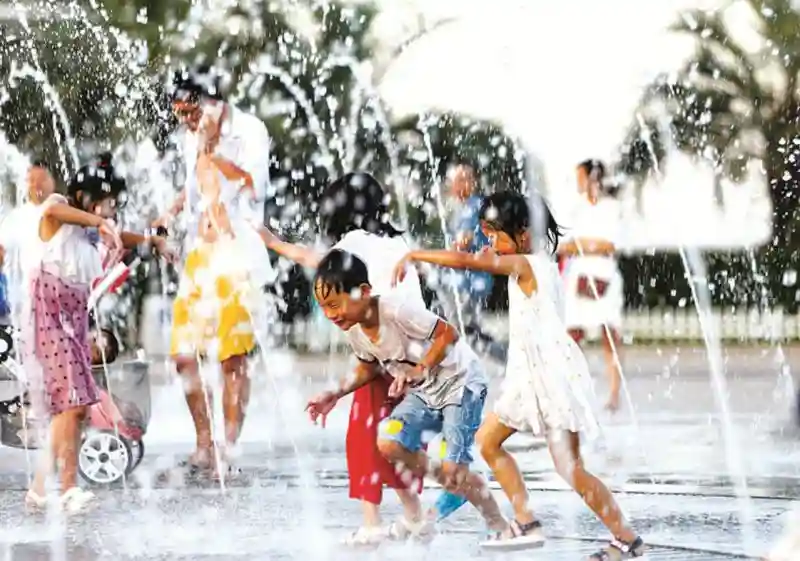 图中的孩子正在月亮广场喷泉边戏水,穿梭、奔跑、打闹他们的笑声是世界上最“凉爽”的声音,也是我们的快乐源泉。