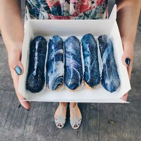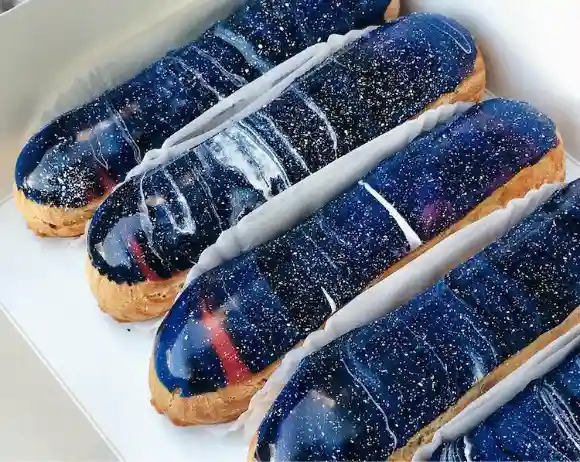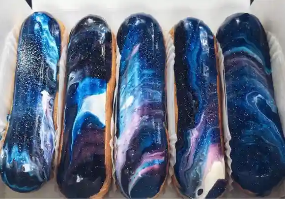 为了捕捉“宇宙之美”,每个星际泡芙的灵感都源于太空美学。各种蓝色、紫色和粉红色的漩涡混合在一起,形成了斑斓的星系。尽管用简单的原料制成,覆盖着显眼的颜色鲜艳的糖和人工色素,每个泡芙都能媲美哈勃太空望远镜拍摄的照片中迷人的色彩和迷人的深度,证明了糕点无限的艺术可能性。