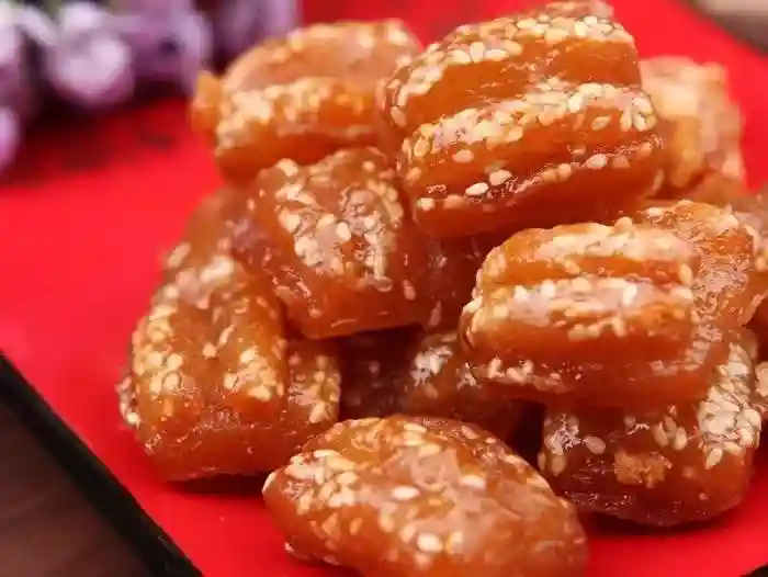 晒干用油煎,蘸糖、芝麻等制作而成