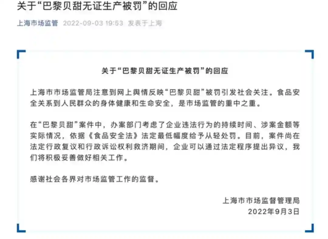 02处罚是否过重?上海市场监督管理局后对此次事件做出了回应,大意是已经给与从轻处罚,但是为什么依然引起了争议呢?原因有很多,至少有一点是没有考虑在全市范围静默管理这种特殊情况下,巴黎贝甜在非经营场所从事生产经营是否属于不可抗力下的情况。