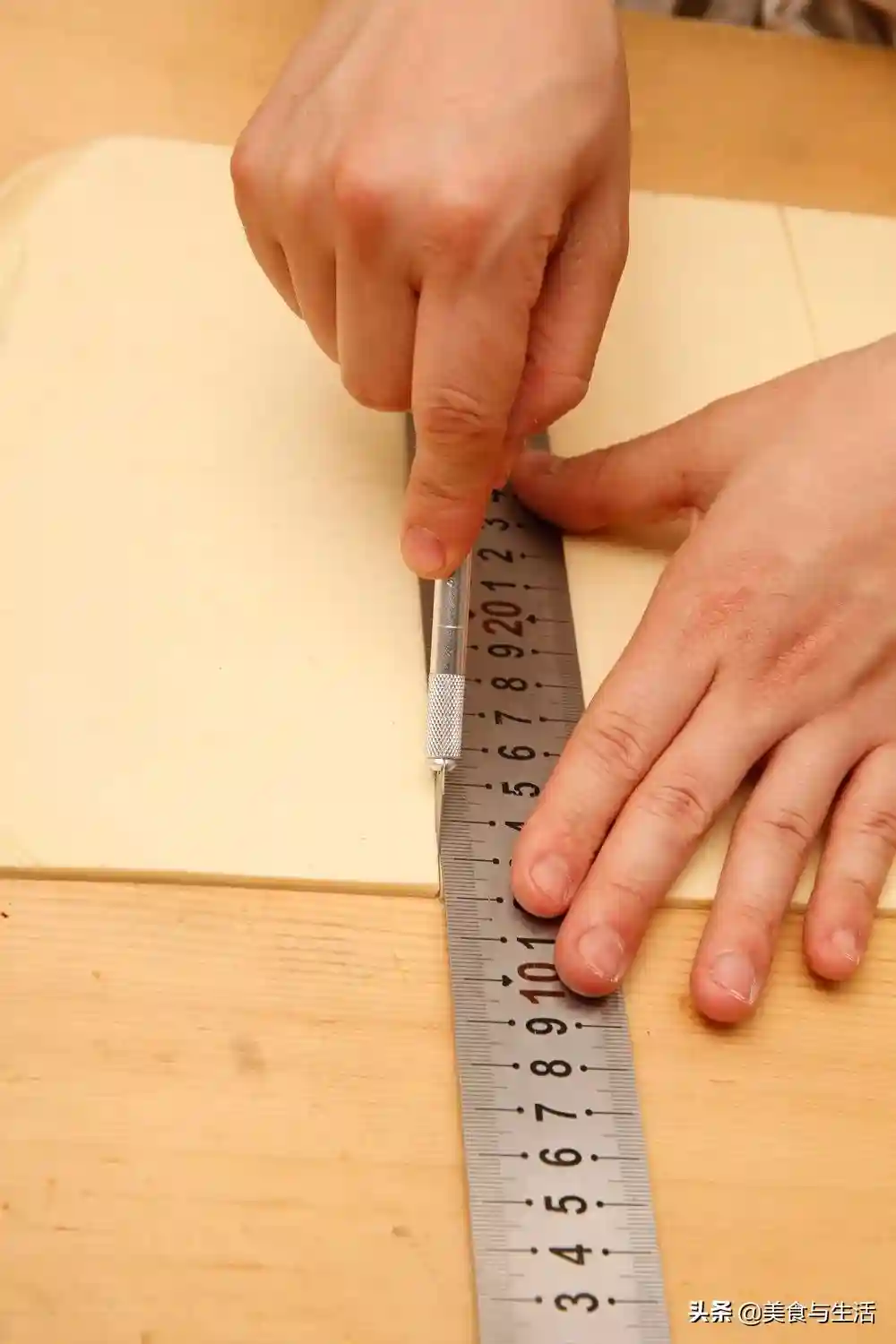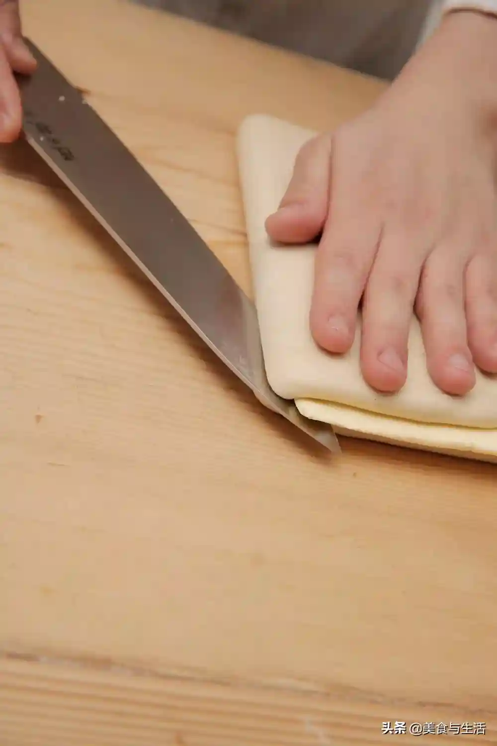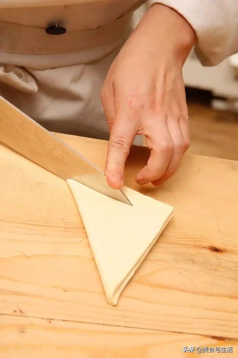 11.将面团边缘多余部分裁掉,并裁剪12厘米X12厘米的等腰三角形(每个约60克)。