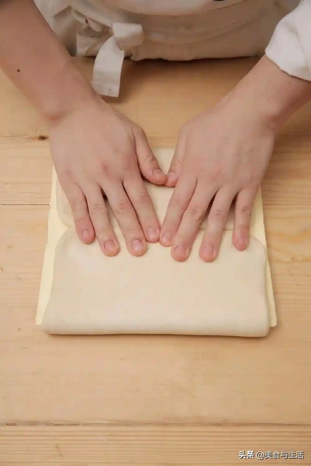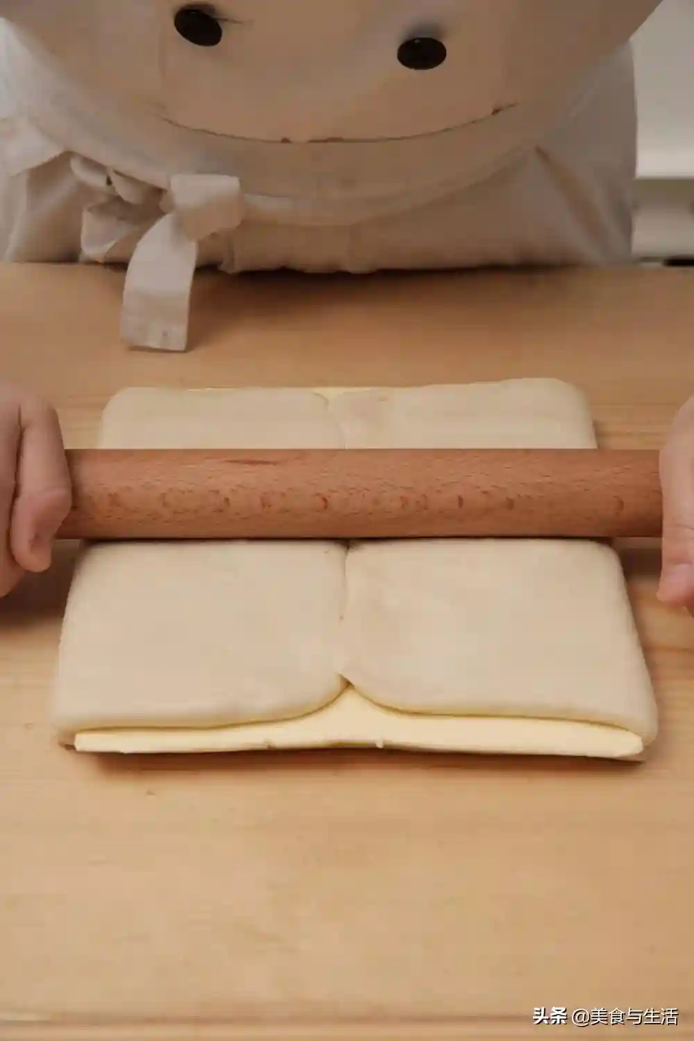 7.用擀面杖稍加擀压一下,使其面团和油脂更贴合。