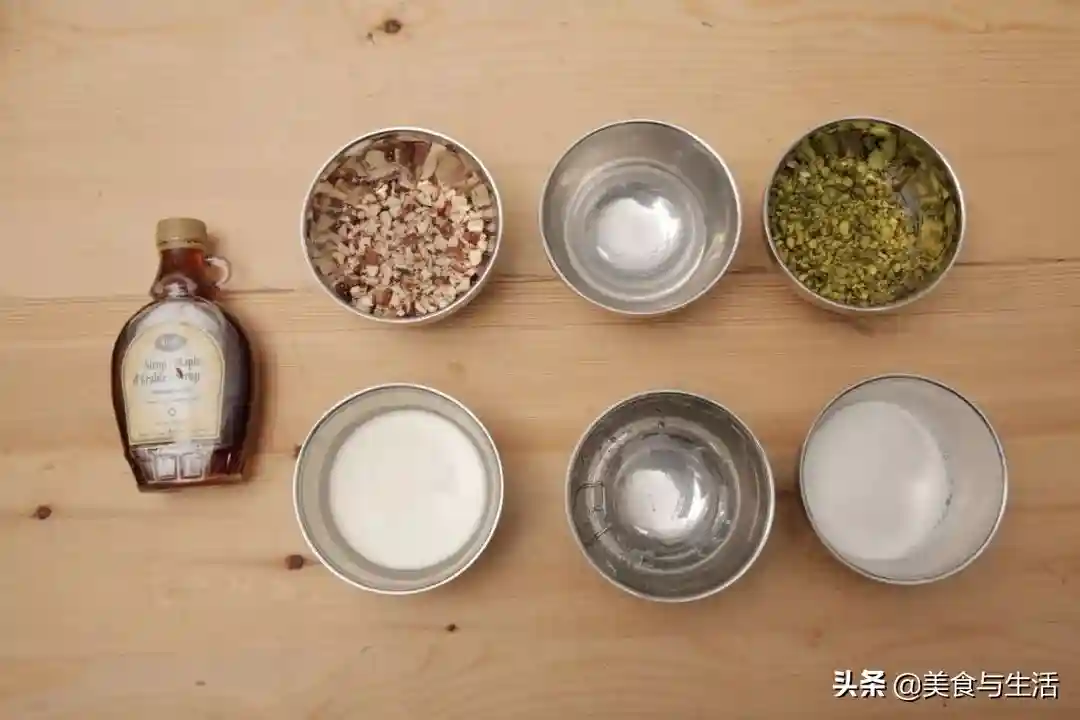 材料:细砂糖150克、葡萄糖浆60克、水75克、淡奶油105克、枫树糖浆22克、绿开心果碎(去皮)75克、榛子碎(熟)75克、