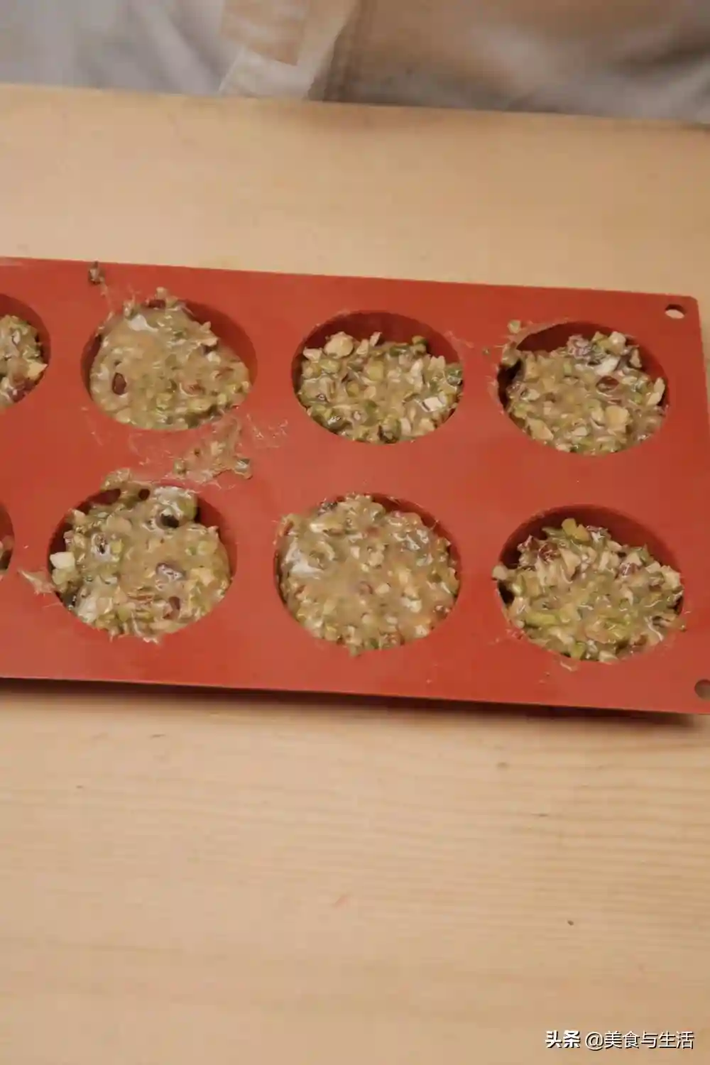 3.加入绿开心果碎(去皮)和榛子碎(熟),充分搅拌均匀。