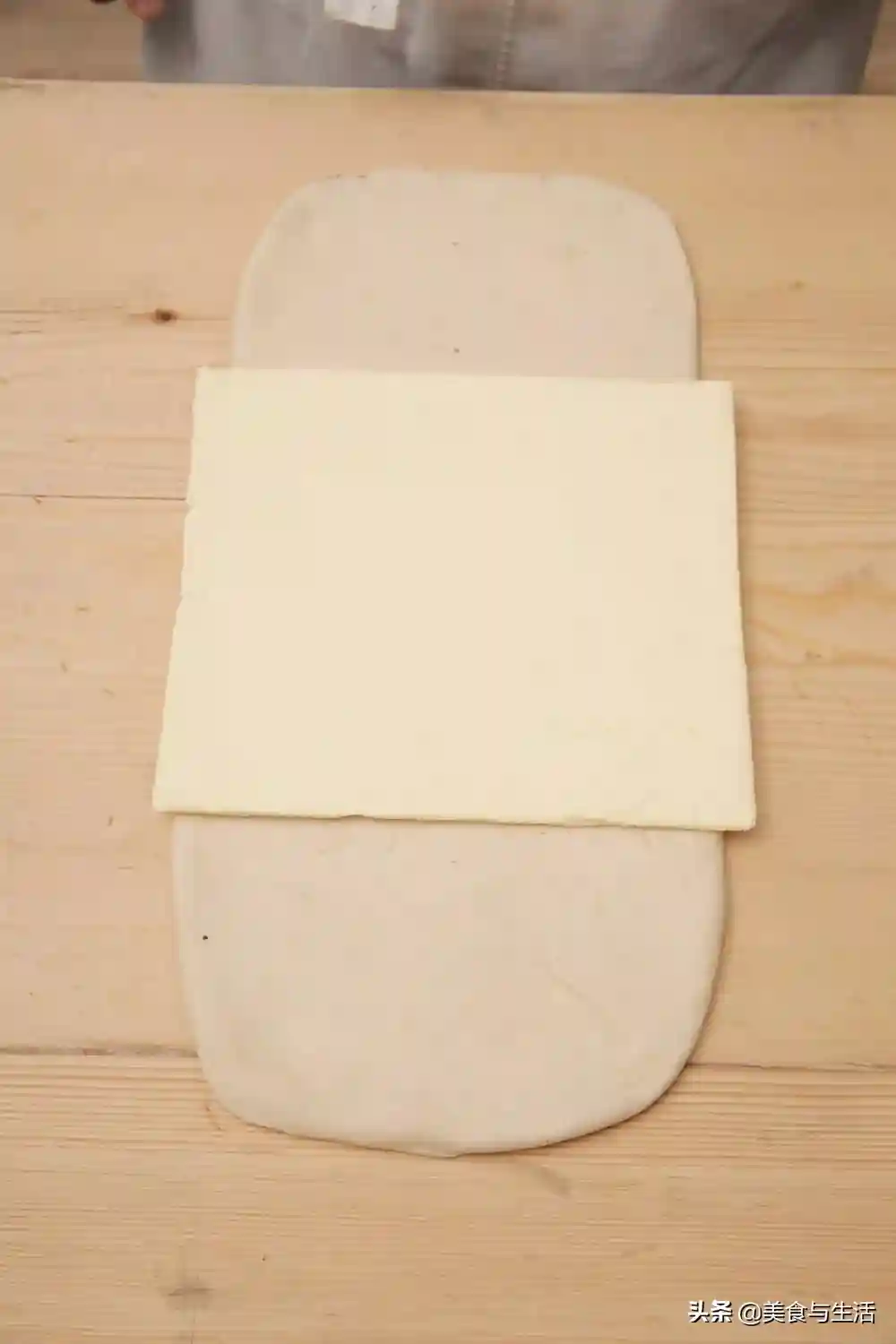5.将片状黄油进行敲打至22厘米X22厘米,增强油脂的延展性,将面团取出擀压至油脂的2倍大,并把油脂包入。