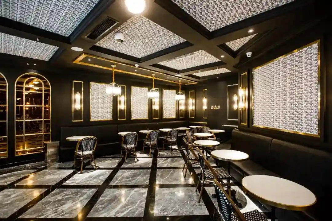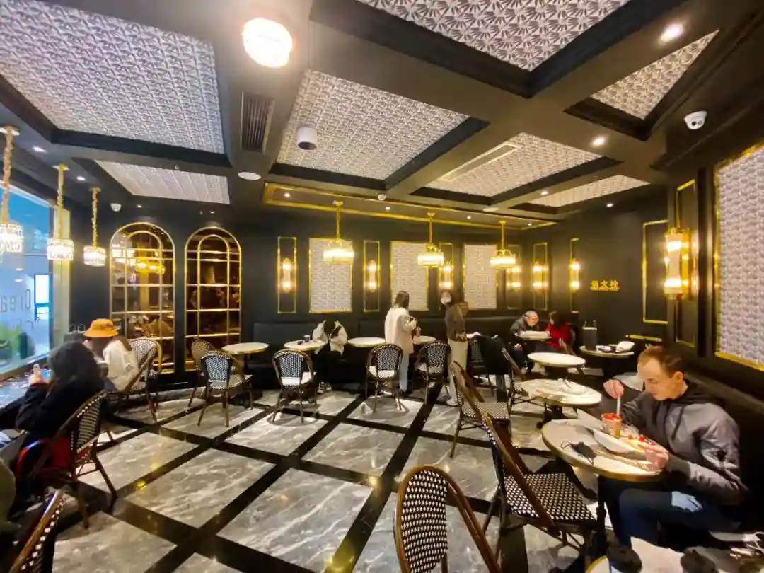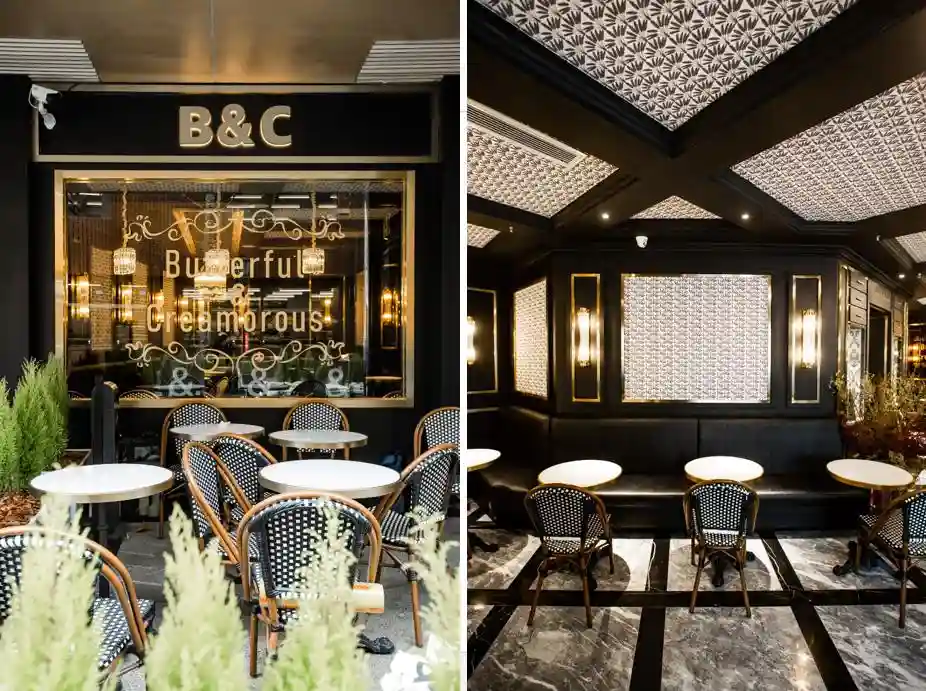 “黑金”设计打破传统烘培店风格。区别于市面上常见的烘焙品牌,BC在整体设计上以黑色为主色调,搭配金色金属线条装饰,形成较强的时尚感,在一种暖色调风格中独树一帜。