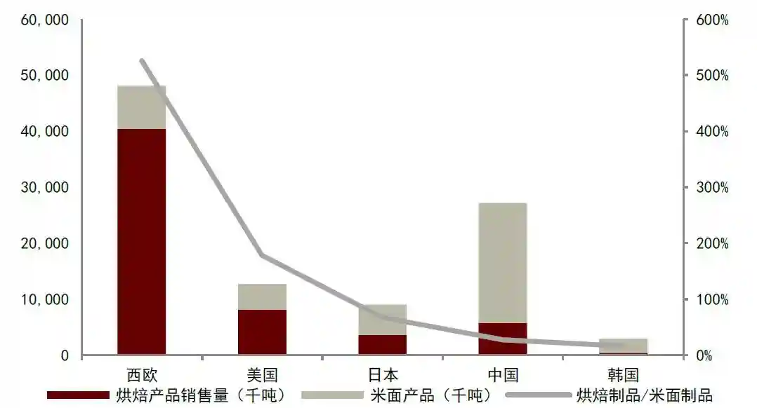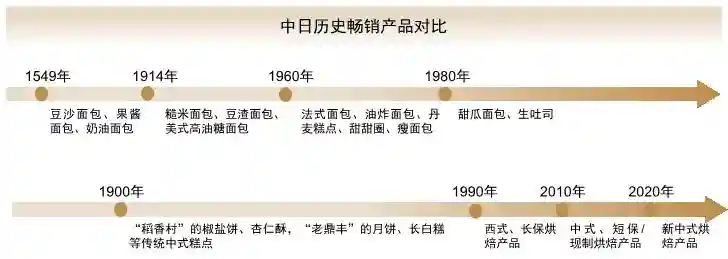 在产品发展角度,中国和日本烘焙行业发展的相似点:起源于国家传统产品,大规模生产起源于西式烘焙产品,国家传统产品持续创新;差异点:日本1960年代出生的人童年时期具有烘焙主食的饮食习惯培养,日本烘焙产品兼具主食和零食属性,且日式烘焙发展时间长、创新能力较强,人均食用量高。中国烘焙产品中零食属性高于主食属性,中式烘焙尚需发展,人均食用量有待提升。