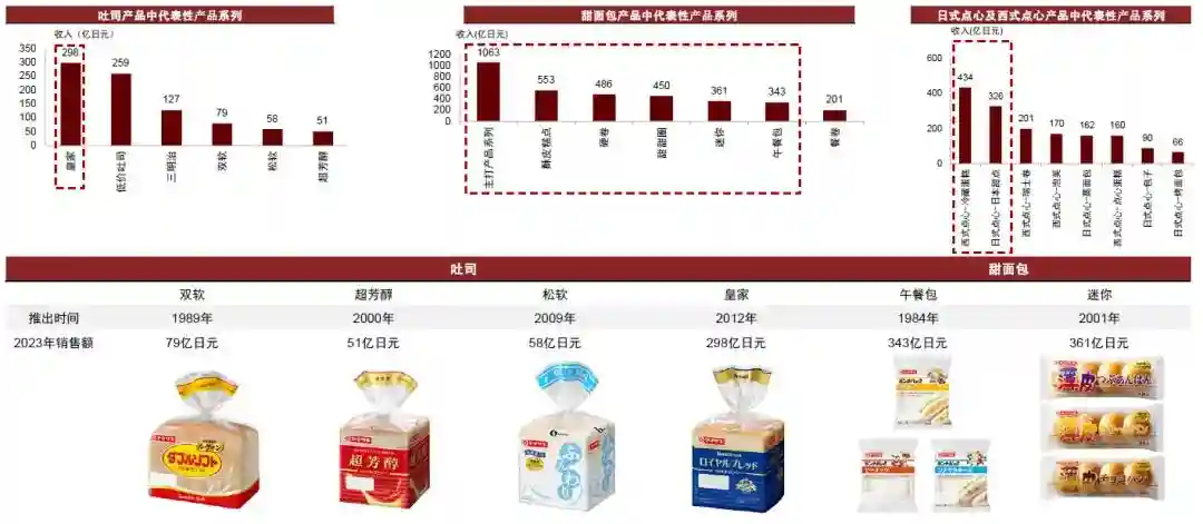截至2023年,山崎烘焙产品主要包括吐司面包、甜面包、日式点心、西式点心四大类别。营收超过500亿日元的产品系列包括甜面包中的主打面包、酥皮糕点,营收300-500亿日元的细分品类包括甜面包中的甜甜圈、硬卷、迷你、午餐包,日式点心中的日本甜点以及西式点心中的冷藏蛋糕,营收100-300亿日元的产品系列包括吐司面包中的低价吐司、三明治,甜面包中的餐卷,日式点心中的蒸面包以及西式点心中的瑞士卷、点心蛋糕、泡芙。介于50-100亿日元的产品系列有3个,分别是“双软”、“超芳醇”、“松软”吐司。
