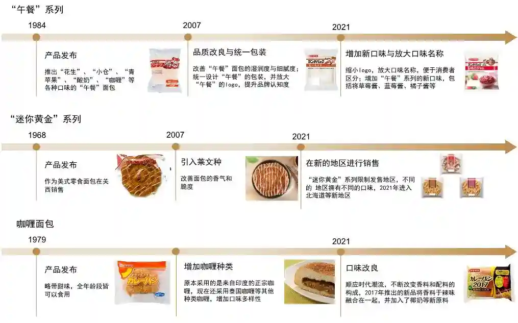 烘焙产品系列矩阵横向扩张,并结合需求变化对产品进行创新,利用供给创新创造获取市场增量。山崎不断对产品系列进行升级和细分创新,进而延长产品生命周期。典型的长期畅销的产品系列包括“午餐”系列、“迷你黄金零食”系列以及“咖喱面包”系列。