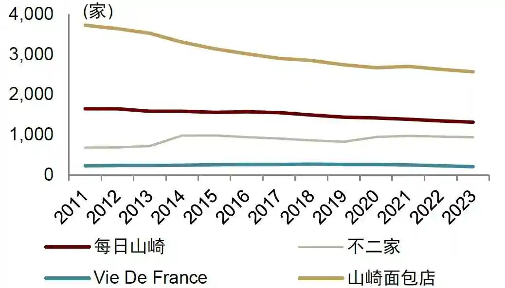 中央工厂+批发模式下,山崎面包因具备基地市场经济发达、更早进行全国化布局的先发优势,以及后期不断对产品、服务和品牌的投入,持续获取市占率。据日本面包工业协会、山崎面包公告,我们推算山崎面包市占率从1985年的23%提升至2006年约42%。据欧睿数据,2012年-2023年Top1山崎面包在烘焙食品行业市占率维持在25%及以上,CR3从39%提升至39.5%。