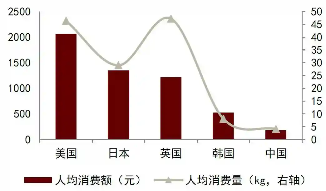 图表11:2023年部分国家/地区烘焙产品人均消费量与消费额