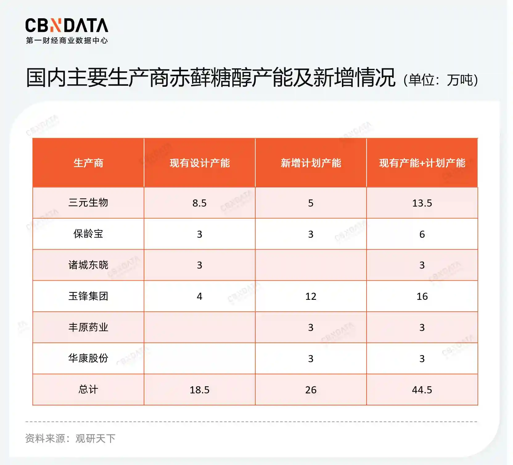代糖B端供应战:赤藓糖醇供过于求,供应商应寻求“多条腿走路”中国是全球最大的甜味剂生产国,全球头部的甜味剂生产商均在国内——包括全球最大的赤藓糖醇供应商三元生物、全球最大的三氯蔗糖和安赛蜜供应商金禾实业、全球第二大木糖醇生产商华康股份、全球前二的罗汉果糖供应商华诚生物等,覆盖甜味剂各个分类。且由于甜味剂的制作过程涉及化学及微生物等多种制作工艺,这门生意存在一定生产壁垒。因此,早在国内这波代糖风潮盛行之前,上述企业早已是隐形的行业巨头。