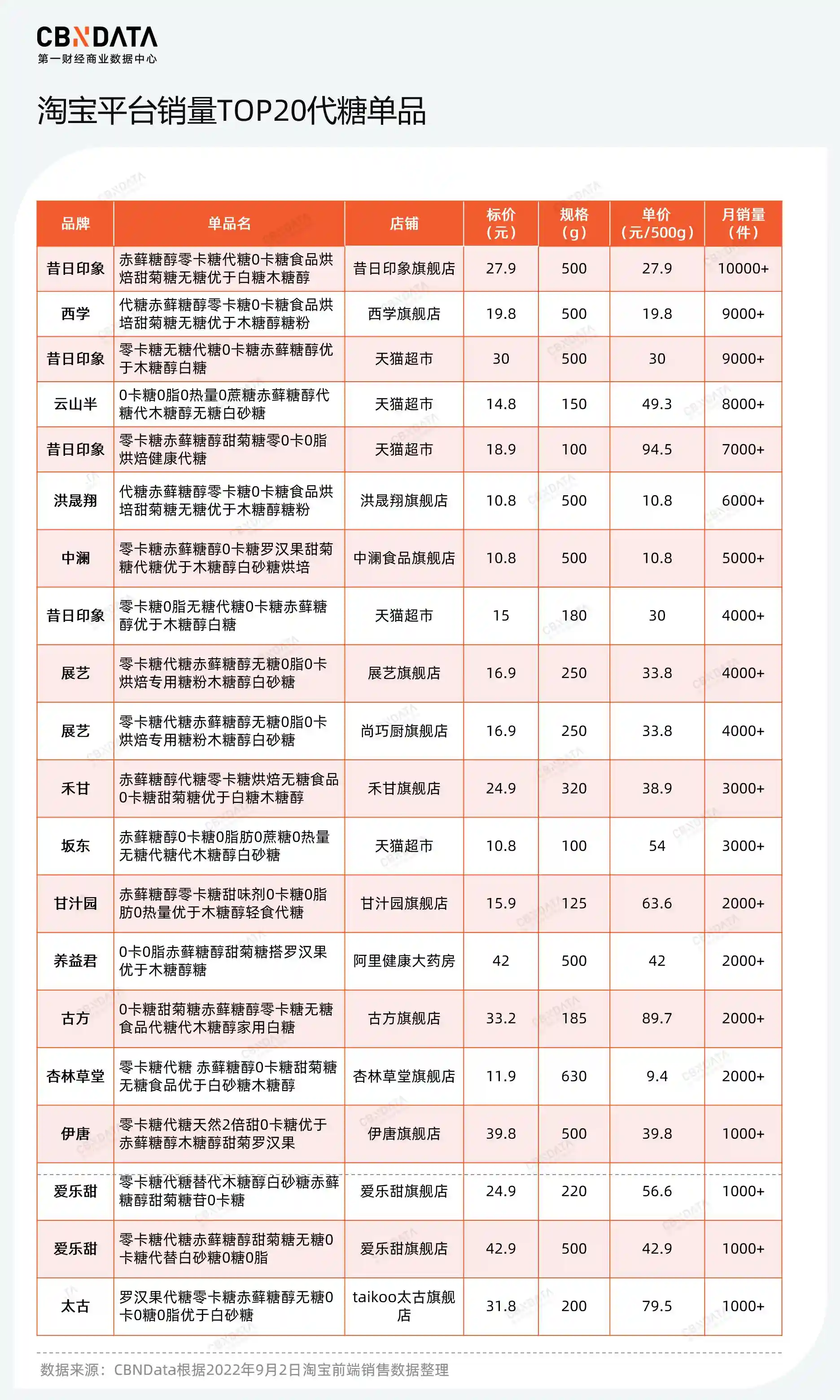 价格方面,代糖的价差可谓十分参差,若以500克为一个单位,单价能在9-95元区间浮动。但CBNData通过观察发现,产品的售价,与代糖是否为复配、品牌是否知名并无直接相关性,消费者选购缺乏一定参考标准。