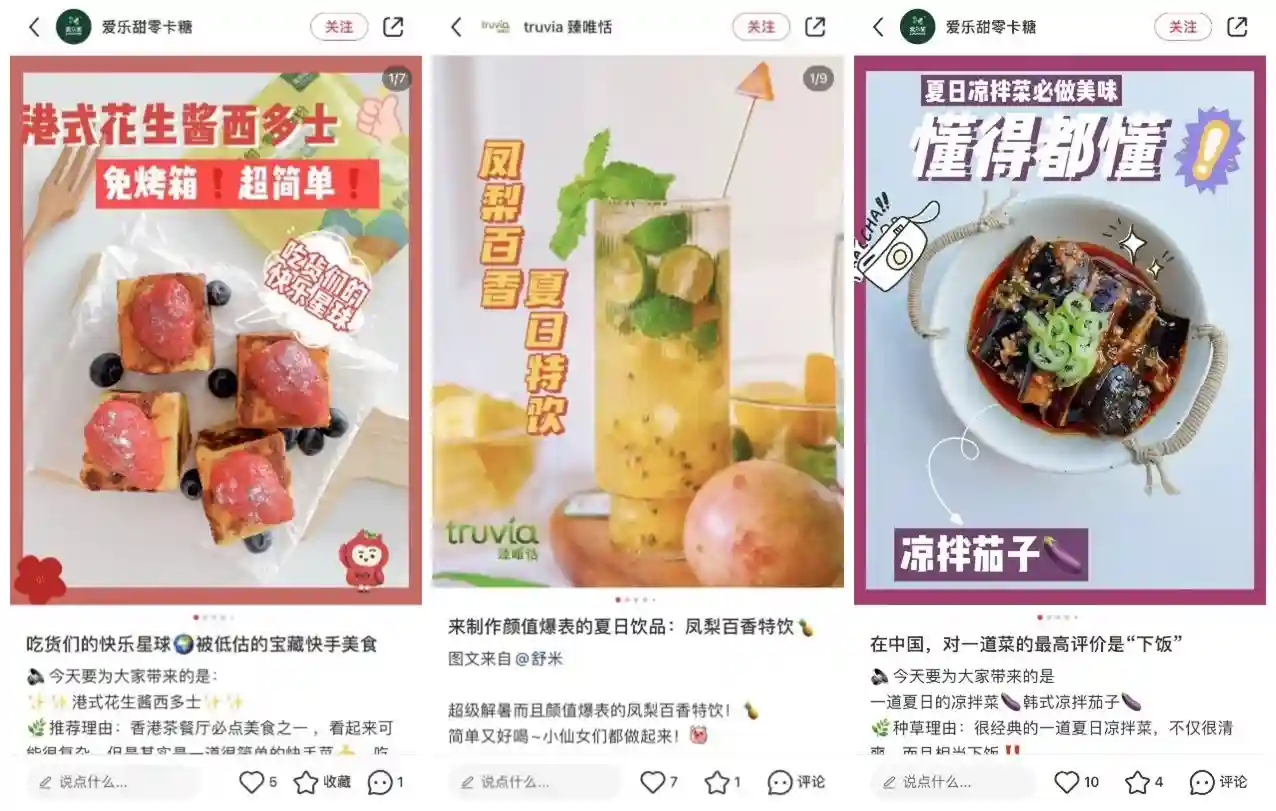 相较之下,专业代糖品牌则在进行更为系统化的市场教育。在小红书平台,爱乐甜、Truvia臻唯恬等品牌官方号的笔记大多围绕自制饮品、自制糕点、中餐教程展开,不断向消费者传达在日常饮食中用代糖替代蔗糖的理念。为了进一步扩大品牌影响力,禾甘在网综《星妈请回答》中进行了植入,爱乐甜则邀请了胡先煦担任品牌代言人。