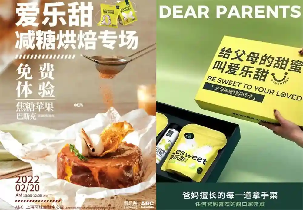 联合更多品牌,借助更多场景,也是代糖品牌的重要推广路径。爱乐甜曾与超级猩猩、沪上阿姨、QSSD烘焙等多个终端消费品牌推出联名礼盒,由此勾连起健身、茶饮、烘焙等多元场景。线下方面,爱乐甜曾在上海核心商圈发起减糖烘焙免费体验活动。还在上海部分社区发起“父母换糖特别行动”,居民可用家中的白砂糖免费换取爱乐甜代糖产品,同时推出同名礼盒,试图打入送礼场景。