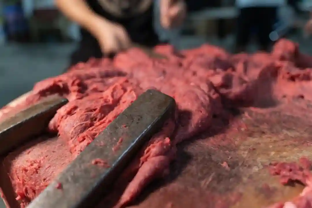 潮阳铜盂自牛肉生产、分发有着经验打磨的一整条链路:专门的养牛场,周边分布着大小几十上百家手打牛肉丸店,各大商家采买新鲜牛肉,当天手工锤成牛肉丸,再分发售卖出去。