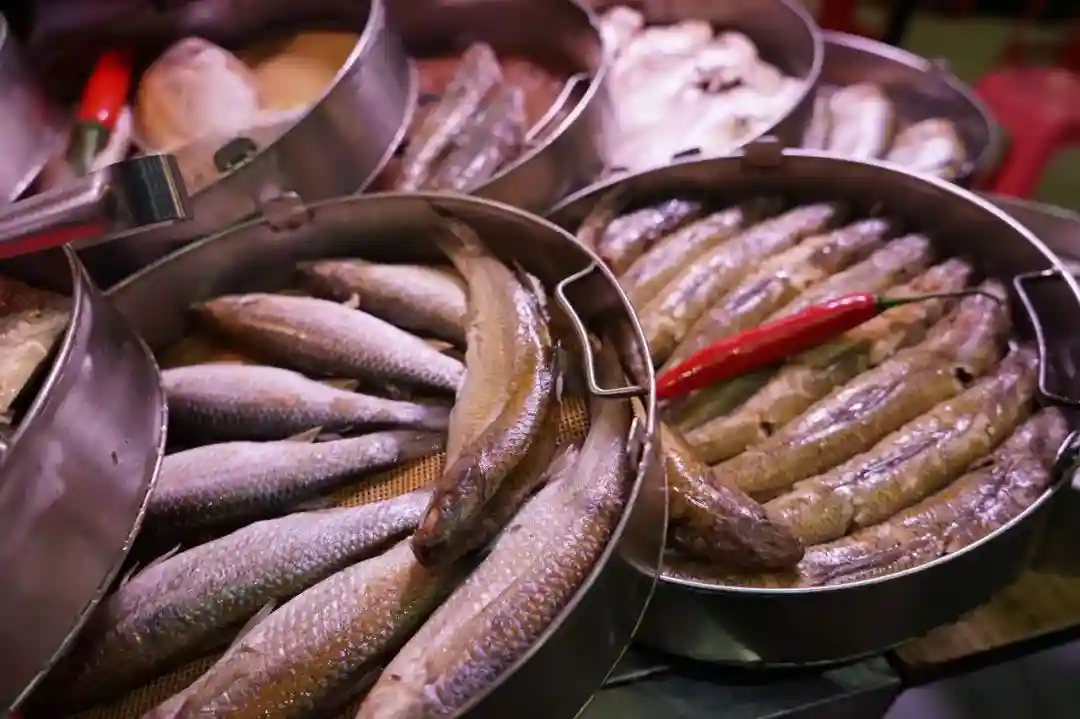 传统的鱼饭是用新鲜的海鱼保留内脏和鱼鳞摆放在鱼篮里煮熟,搭配酱油、豆酱去吃。