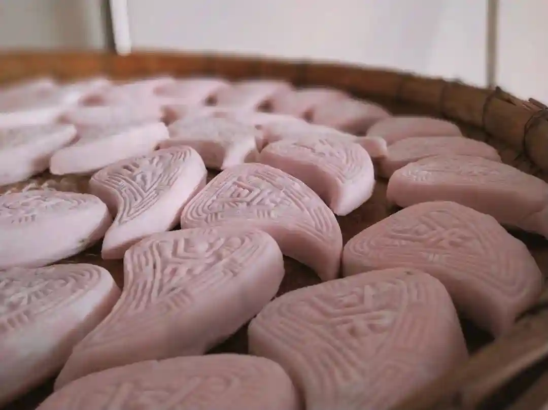 朴实的外表背后是较长的制作工序:精选新鲜糯米,混细沙进铁锅炒熟,筛掉砂后,在湿度适中的环境中放置十天半月,最后按模成形。