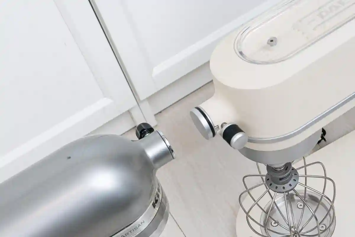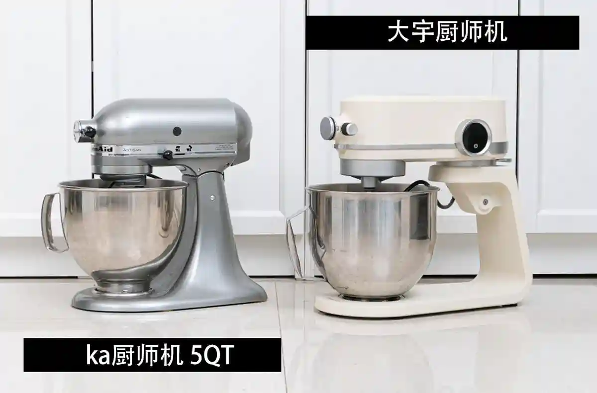 三、同样是厨师机有什么差异▼而同样是厨师机,又会有什么样的差异呢,我入手的第一台厨师机是ka的5Qt,ka是很多专业烘焙学校以及很多西方的烘焙教程里常用到的厨师机品牌,长期使用下来好处是皮实耐用,缺点是价格较贵,当时国行入手价在5000左右。以及全机械化的操控,没有定时功能,便利性要稍差一些。而大宇厨师机的价格在两千多,价格要更低一些,基本的结构和ka的类似,在一些细节上,有新颖的设计,比如电子计时的加入,抬头停机的安全设计。具体两者的差异如何呢,我们来看看吧。